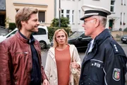 Der Einbruch im AuktionshausKathi (Mandy Neidig) ringt verzweifelt mit sich, ob sie zur Polizei gehen soll. Robert (Felix Maximilian, l.), Polizist (Werner Rave)Bild: © TVNOW / Stefan Behrens