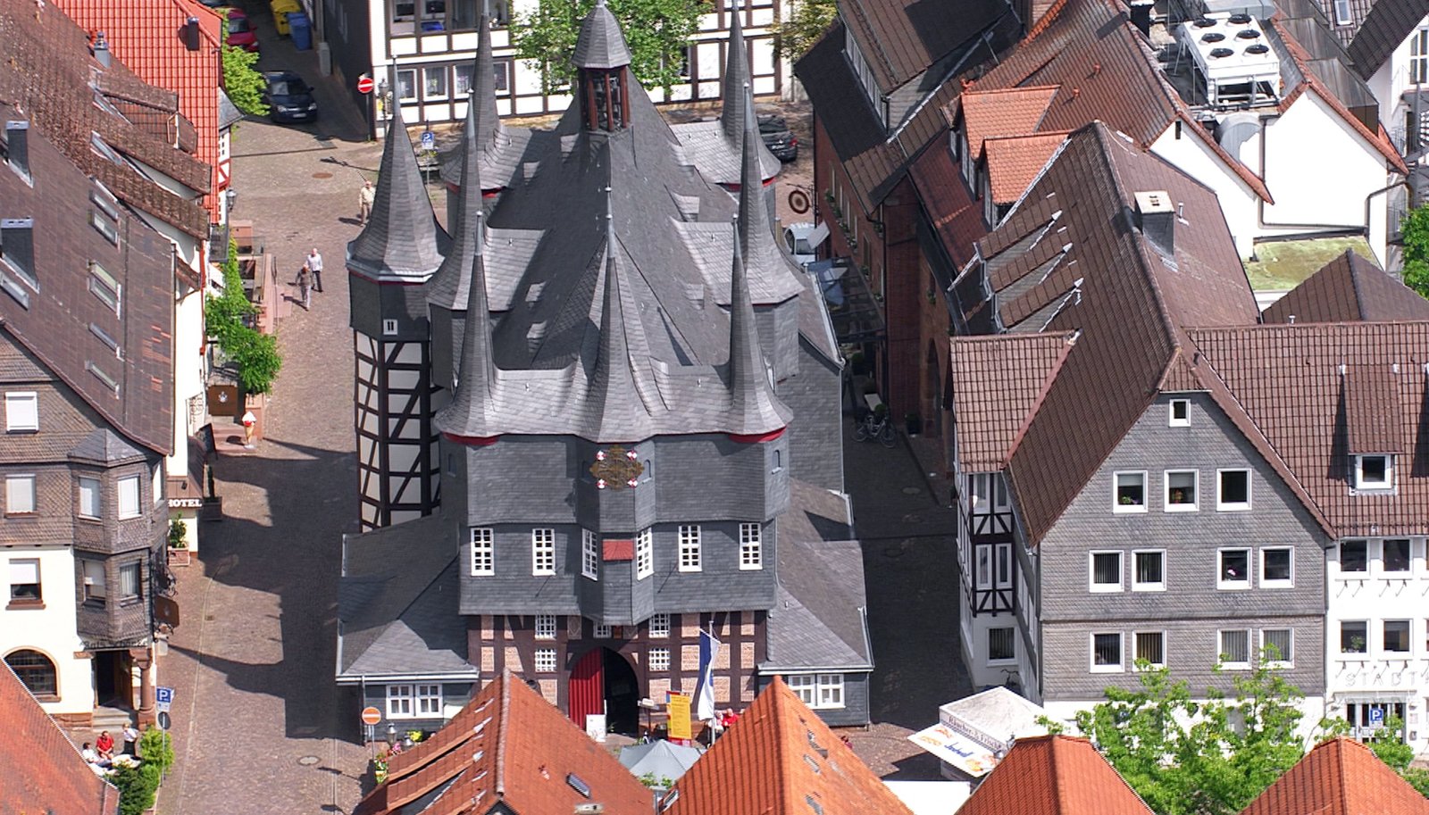 Eder, Fulda und Werrahr-fernsehen HESSEN VON OBEN - EDER, FULDA UND WERRA, Ein Film von Eckhard Braun, am Freitag (03.10.14) um 20:15 Uhr. Hessen von oben: Blick auf das Rathaus von Frankenberg (Eder).Bild: © HR