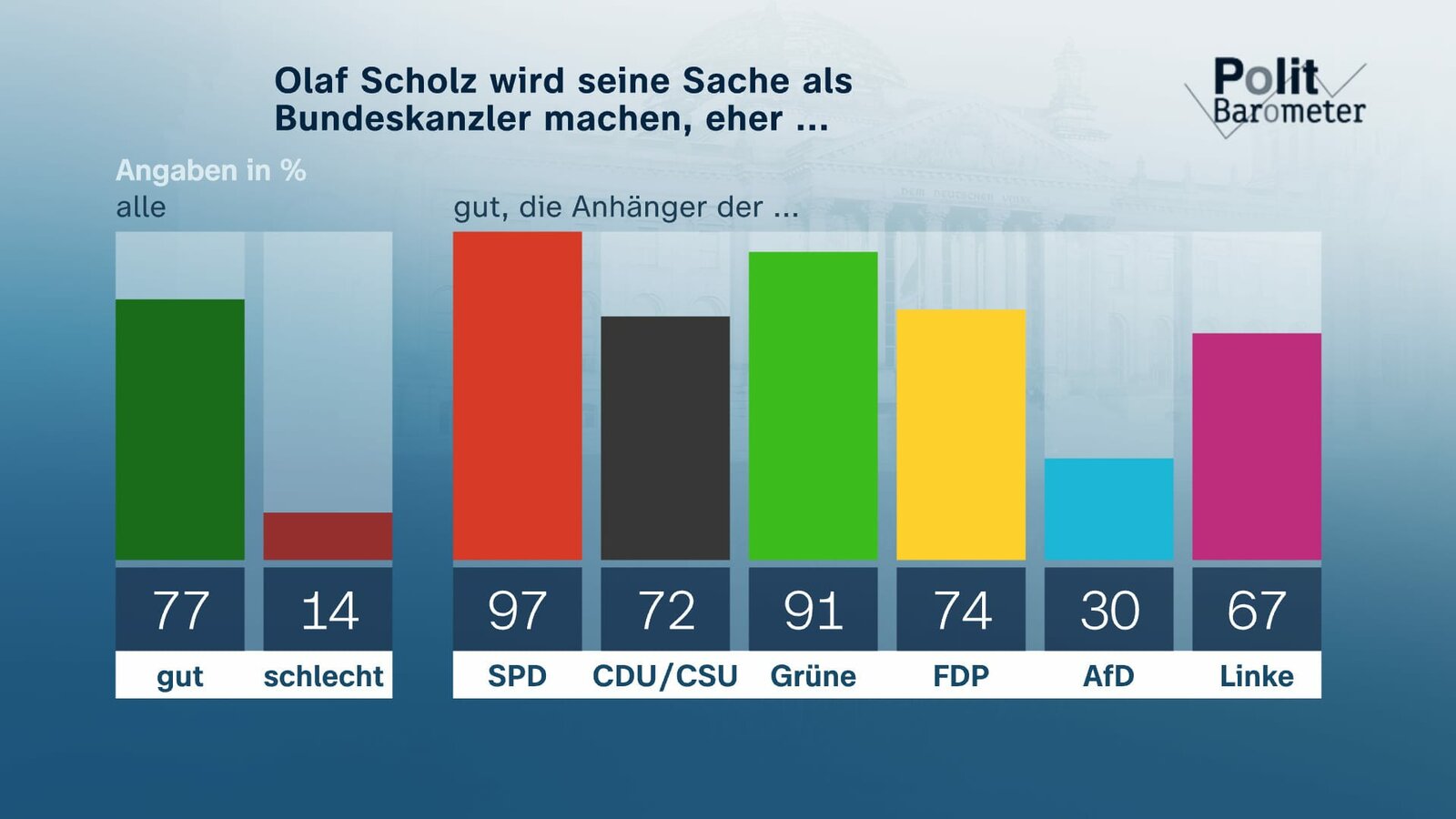 Olaf Scholz macht seine Sache als Bundeskanzler eher ...Bild: © ZDF und Forschungsgruppe Wahlen./Forschungsgruppe Wahlen