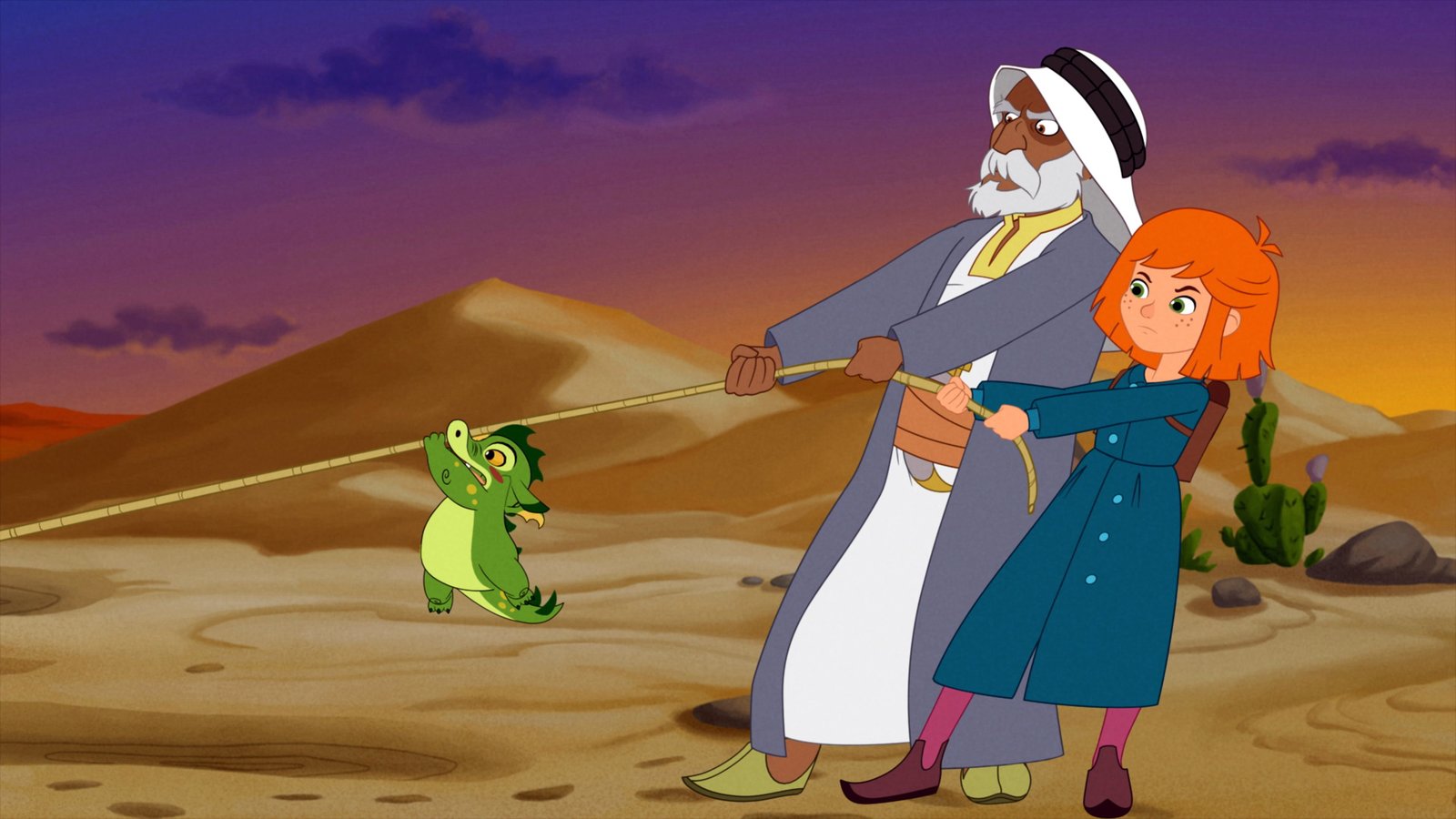 Lilli und das WüstenabenteuerLilli und Hektor ziehen zusammen mit dem Stammesführer Abu mit einem Seil aus Treibsand.Bild: © ORF 1