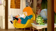 Lilli und das Geheimnis des ParfumsLilli liest ein Buch im Wohnzimmer, Hektor nascht.Bild: © ORF 1