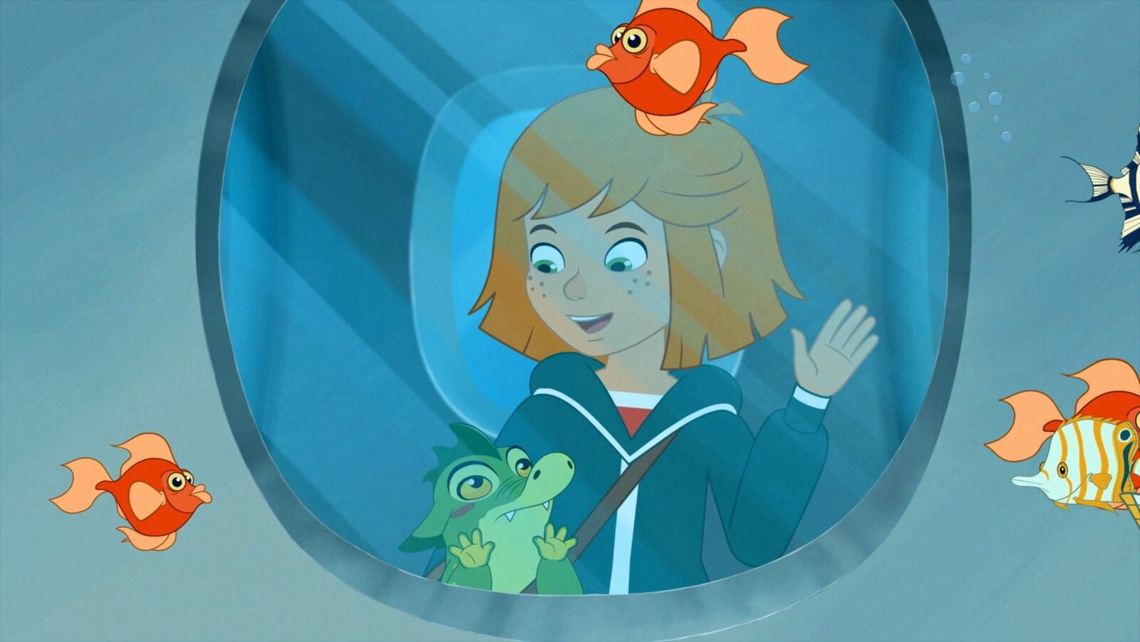 Lilli und das HaibabyLilli und Hektor betrachten orangene Fische im städtischen Aquarium.Bild: © WDR