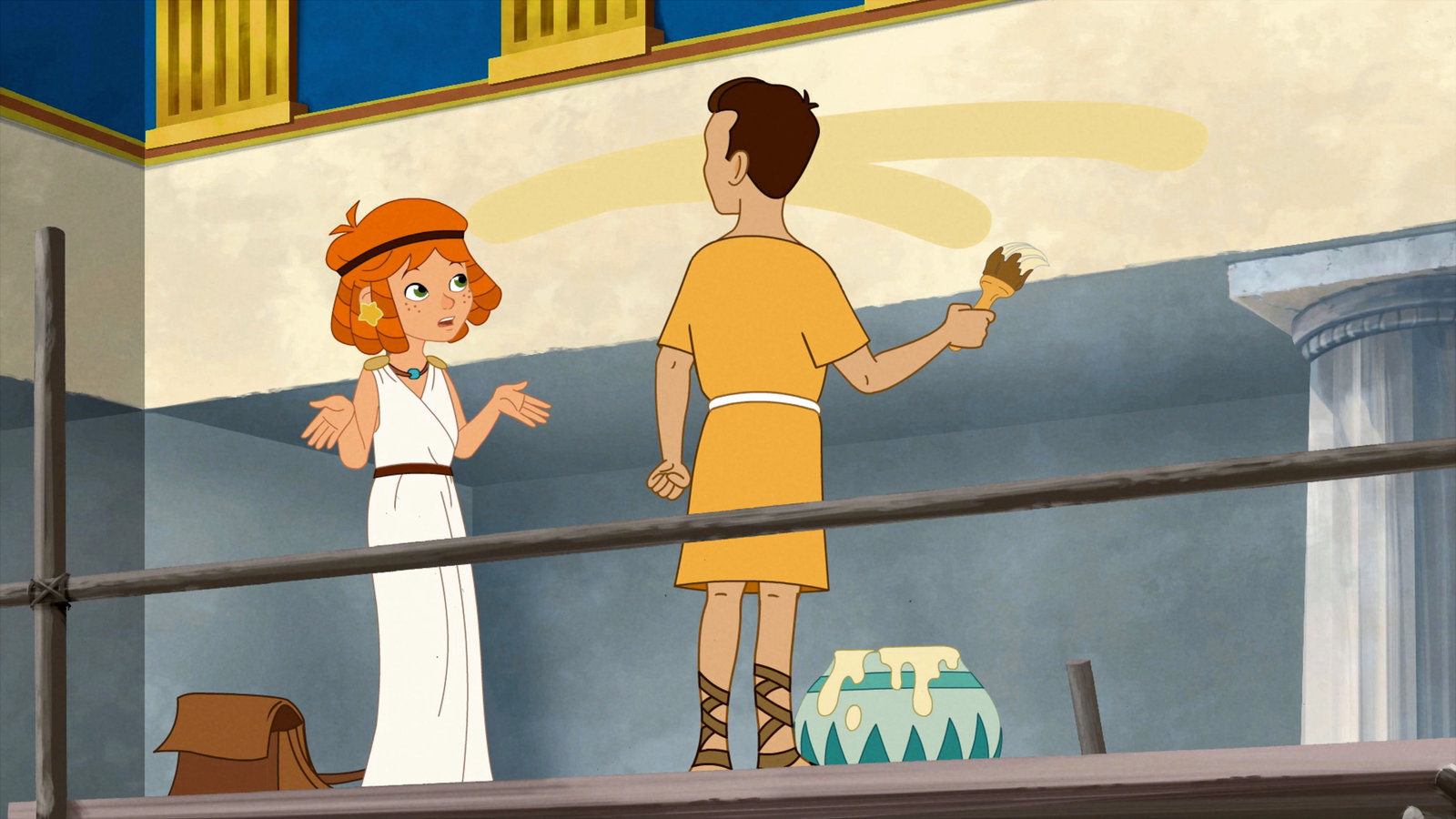 Lilli bei den Olympischen SpielenHerakles zeigt Lilli Übungen für Diskuswurfbewegungen im Zeustempel.Bild: © ORF