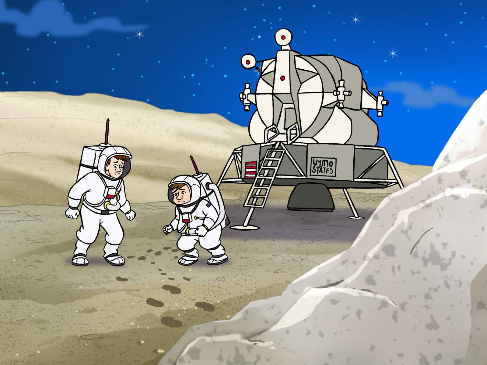 Lilli fliegt zum MondARD/WDR HEXE LILLI II. STAFFEL TEIL 26, "Lilli fliegt zum Mond", am Sonntag (03.07.11) um 06:50 Uhr im ERSTEN. Neil und Buzz (r) trauen ihren Augen nicht: Wo kommen die fremden Fußstapfen her?Bild: © ORF/DOR Film/Trixter Productions, Vivatoon