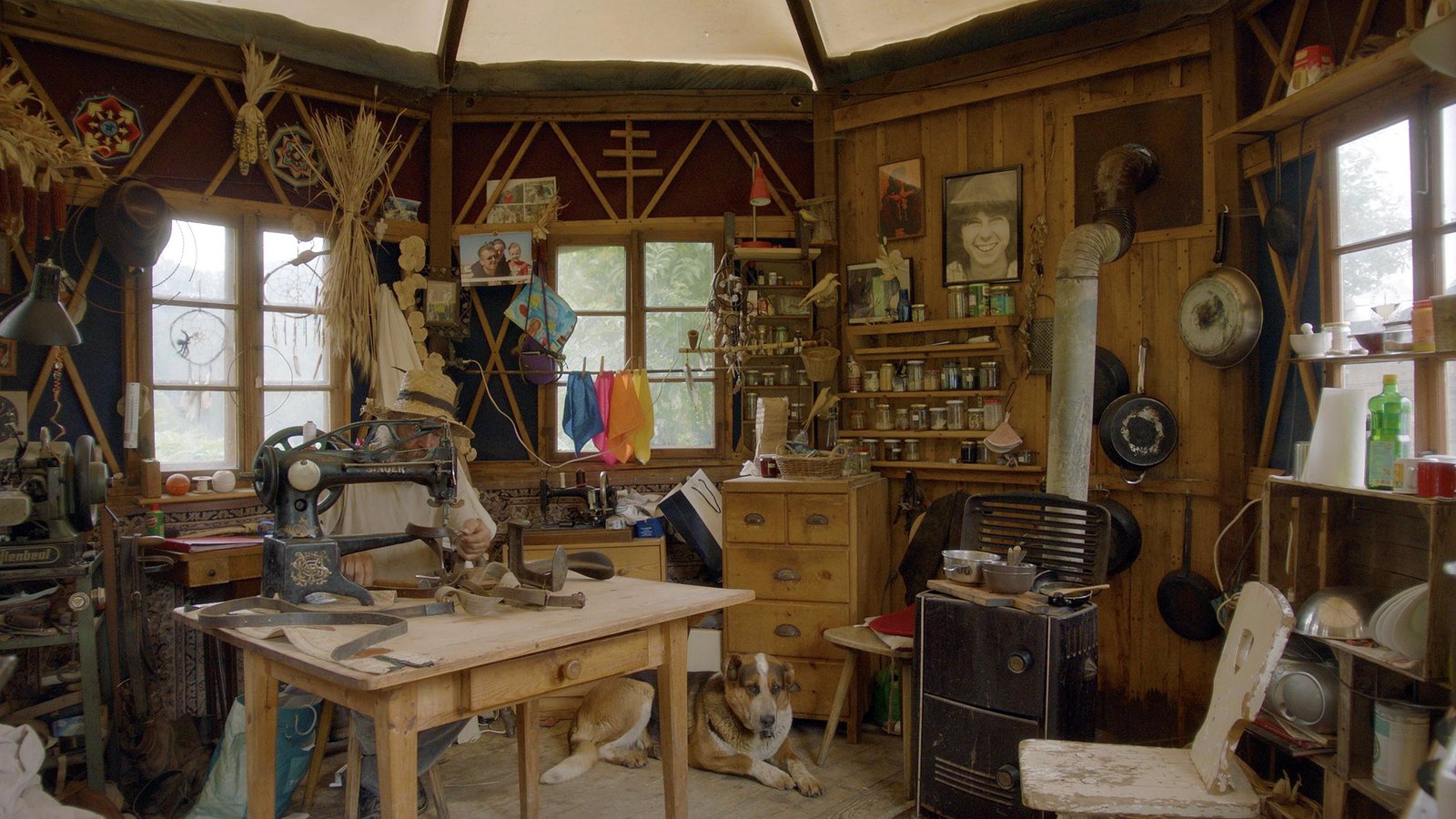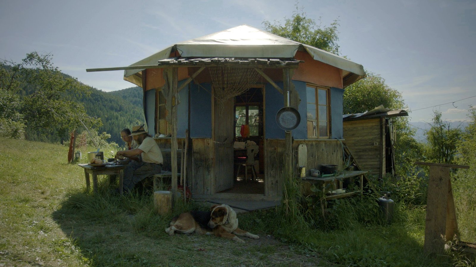 Zuhause ganz einfachElmar "Hube" Schroffenegger und Irene Opela und Hund Schnurfel vor ihrer Werkstattjurte, Steinegg, SüdtirolBild: © ServusTV / Querschuss Film