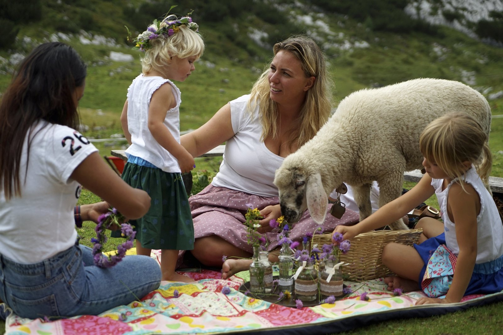 Zuhause hoch drobenHüttenwirtin Mikela Endl mit ihren Kindern, Kranzbinden auf der Alm, Gjaid Alm, KrippensteinBild: © ServusTV / Querschuss Film
