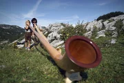 Zuhause hoch drobenPatrick Endl und seine Tochter Resi beim Alphorn spielen auf der Alm, Gjaid Alm, KrippensteinBild: © ServusTV / Querschuss Film