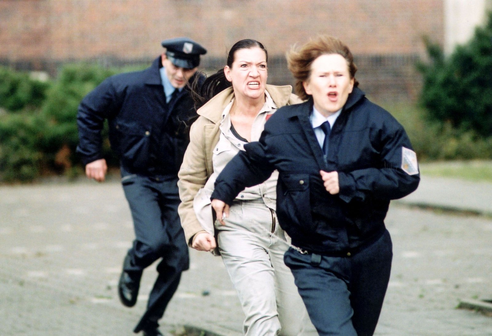 AbflugAls Adler (Claudia Loerding, re.) Nataschas Flucht bemerkt, schlägt sie Alarm und kommt auf den Hof gerannt, gefolgt von Walter (Katy Karrenbauer) und einem Beamten (Komparse). Kommen sie zu spät?Bild: © Passion