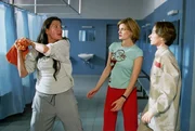 Ich mach dich fertigSchnoor (Uta Prelle, li.) hat Mitleid und deswegen Kalle (Isabelle Höpfner, Mi.) ermöglicht, Nancy (Livia S. Reinhard), die mit einem Zuckerkoma auf der Krankenstation liegt, zu sehen.Bild: © RTL / Richard Hübner
