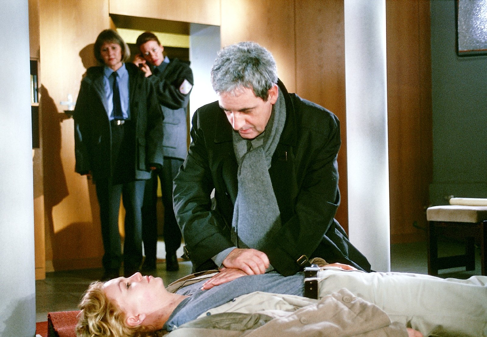 Der letzte AuswegMaximilian (Franz Mey re.) wird von Jutta (Claudia Loerding li.) und Eva (Karen Böhne Mi.) bei der Wiederbelebung Bines (Anette Hellwig liegend) überrascht. Die Situation könnte leicht missverstanden werden.Bild: © RTL