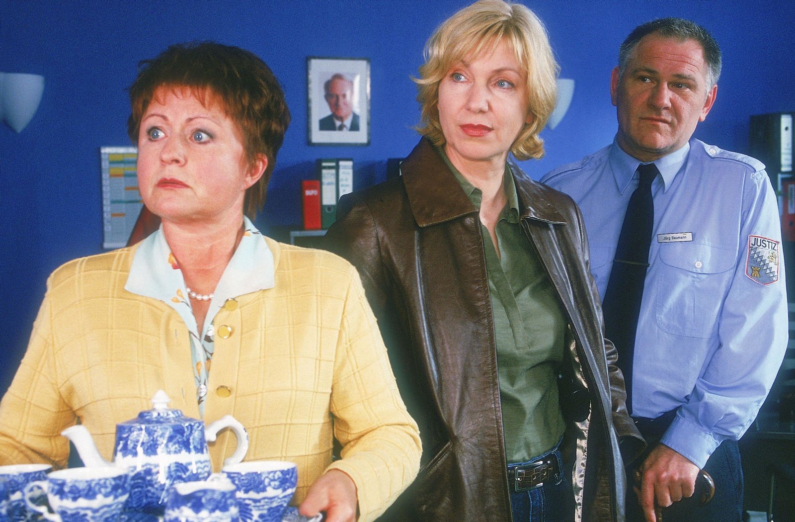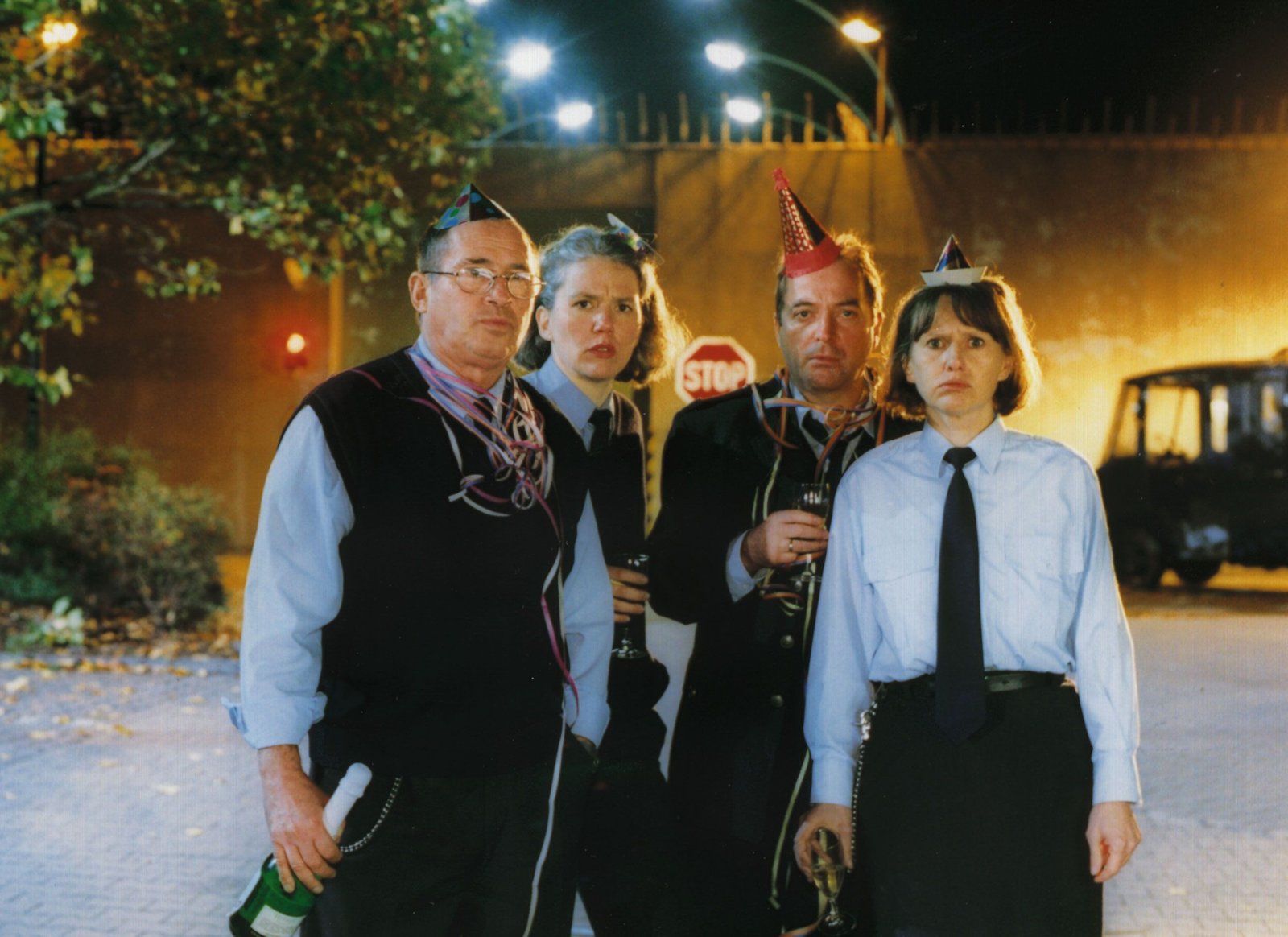 Prost NeujahrJutta (Claudia Loerding, re.) und ihre Kollegen (Egon Hofmann, 2.v.re., Uta Prelle, li. Komparse) wundern sich über den ausgelösten Alarm.Bild: © Passion
