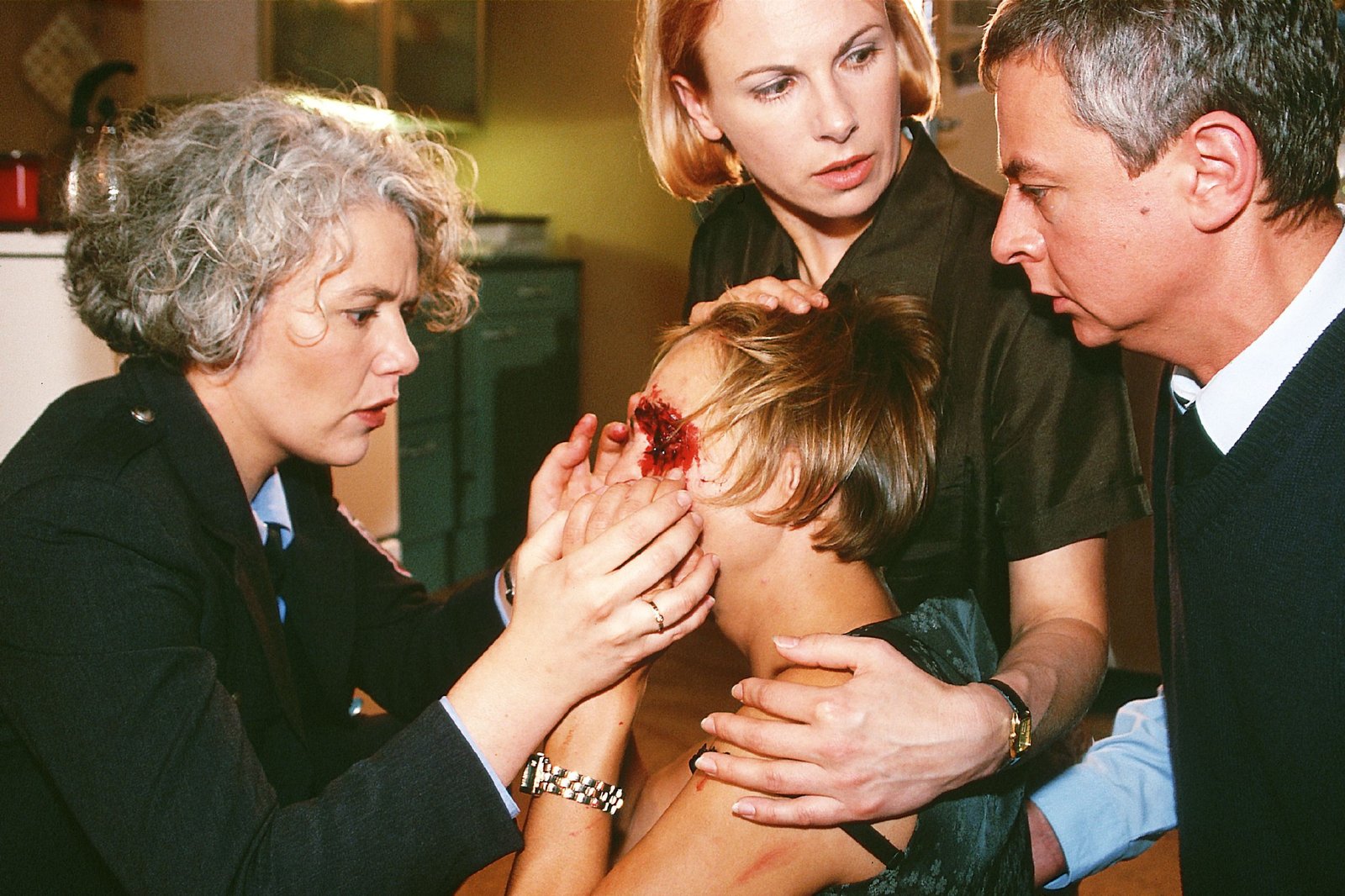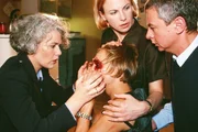 Monas MascheBirgit (Uta Prelle, li.) nimmt die Hände von Monas (Anja Beatrice Kaul) Gesicht und sieht die schwere Verletzung, die Vera ihr zugefügt hat. Die anderen (re. Thomas Engel, re. oben Bettina Kramer) sind schockiert...Bild: © RTL