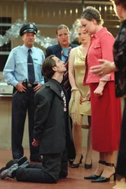Die Kalle FalleAls man ihn abführen will, reißt sich Mike (Tino Blazejewski) los und macht Melanie (Sigrid M. Schnückel, re.) auf Knien einen Heiratsantrag. (hi.v.li. Egon Hofmann, Katy Karrenbauer, Susanne Schlenzig)Bild: © RTL