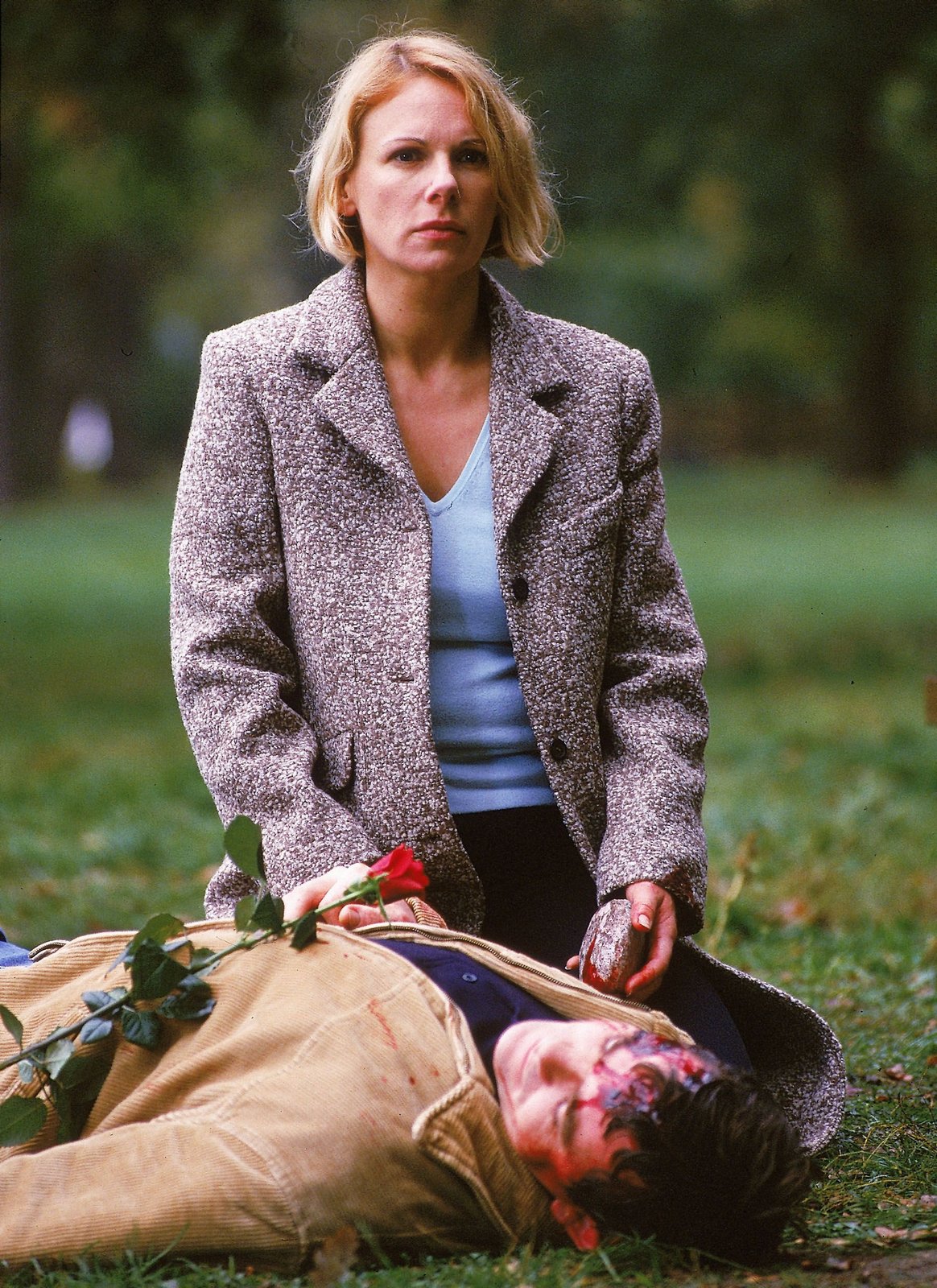Die schwarze WitweAnna (Bettina Kramer), die Lutz (Dirk Schoeron) mit einem Stein erschlagen hat, steht unter Schock.Bild: © RTL