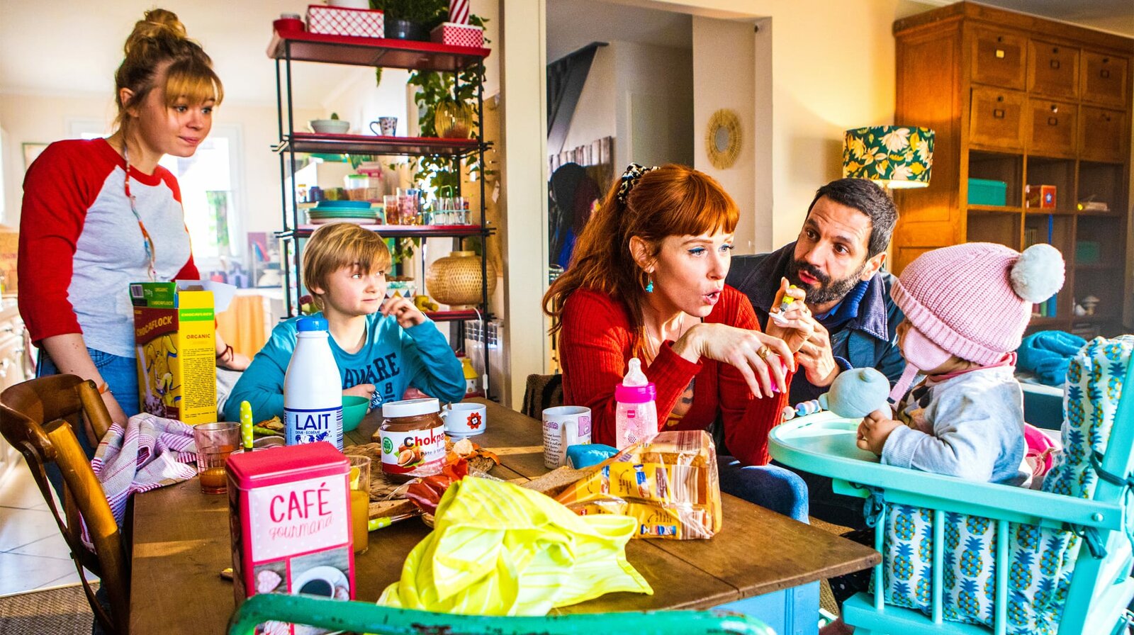 WestwindDrei Kinder (Thea: Cypriane Gardin, l.; Eliott: Noé Vandevoorde, 2. v. l. + Baby) und den Kommissar (Mehdi Nebbou, 2.v.r.) bei sich Zuhause. Morgane (Audrey Fleurot) braucht starke Nerven.Bild: © NDR/PHLIPPE LE ROUX – THIBAUT GRABHERR/SEPTEMBREPRODUCTIONS/TF1
