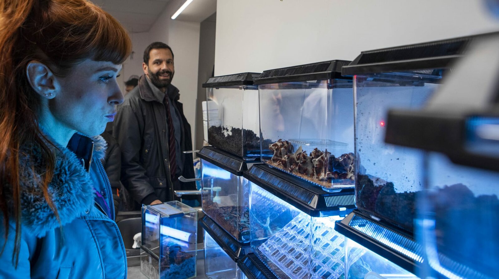 Blinde KuhMordfall in einer Tierklinik. Karadec (Mehdi Nebbou, hinten) inspiziert die Terrarien. (vorne: Morgane (Audrey Fleurot))Bild: © NDR/PHLIPPE LE ROUX – THIBAUT GRABHERR/SEPTEMBREPRODUCTIONS/TF1