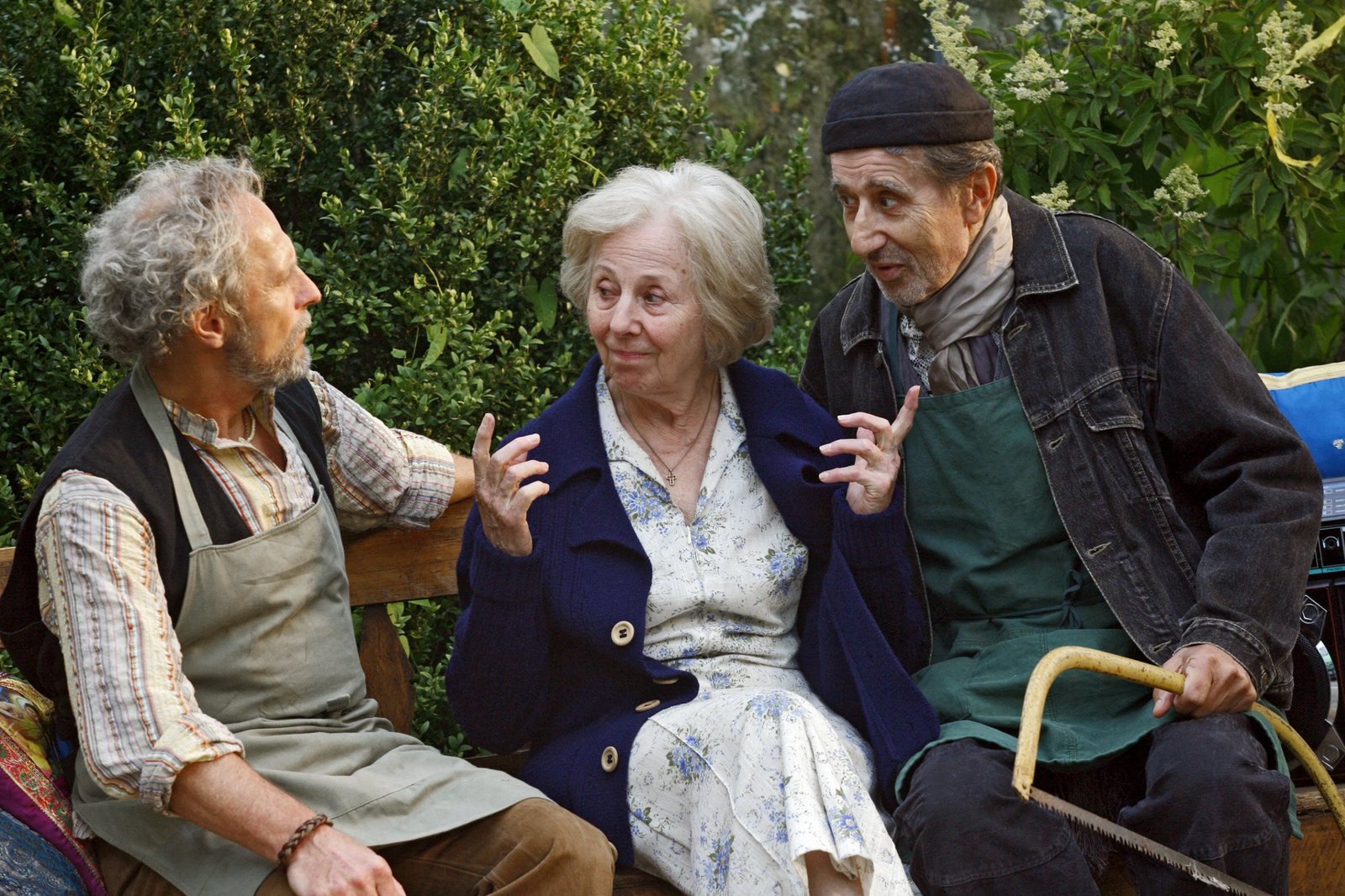 Just Married - Hochzeiten ZweiFritzi (Rolf Zacher, rechts) und Senner (Peter Seitz) versuchen die erfahrene Gärtnerin Erna (Bibiana Zeller) von den Vorteilen des Bio-Anbaus zu überzeugen.Bild: © "ARD Degeto/Erika Hauri" (S 2)