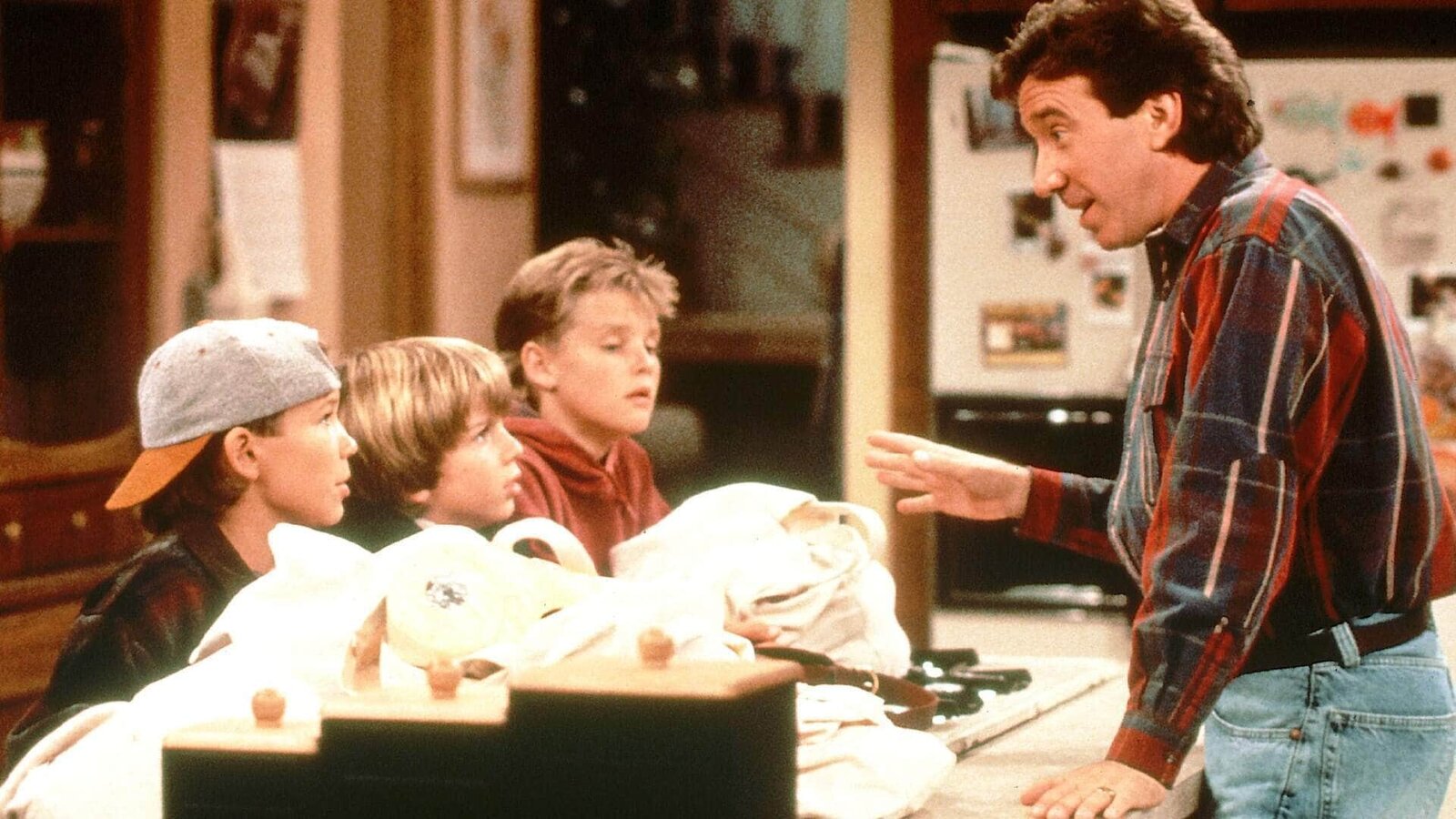 MuttertagTim (Tim Allen, r.) verdonnert seine Söhne (v.li.: Jonathan Taylor Thomas, Taran Noah Smith, Zachery Ty Bryan) zu einer gemeinsamen Bastelstunde, weil Jill sich zum Muttertag Geschenke wünscht, die von Herzen kommen.Bild: © TVNOW / Touchstone Television