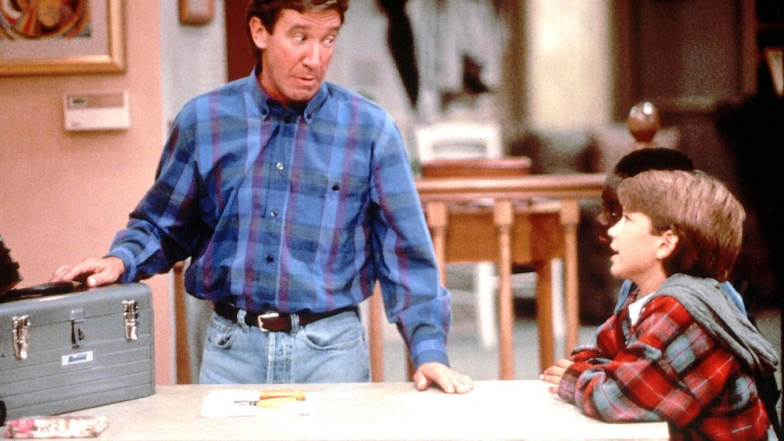 Die WitzfigurRandy (Jonathan Taylor Thomas, re.) steckt mitten in der Pubertät und reizt seinen Vater Tim (Tim Allen) mit frechen und kränkenden Bemerkungen bis zur Weißglut.Bild: © TVNOW / Touchstone Television
