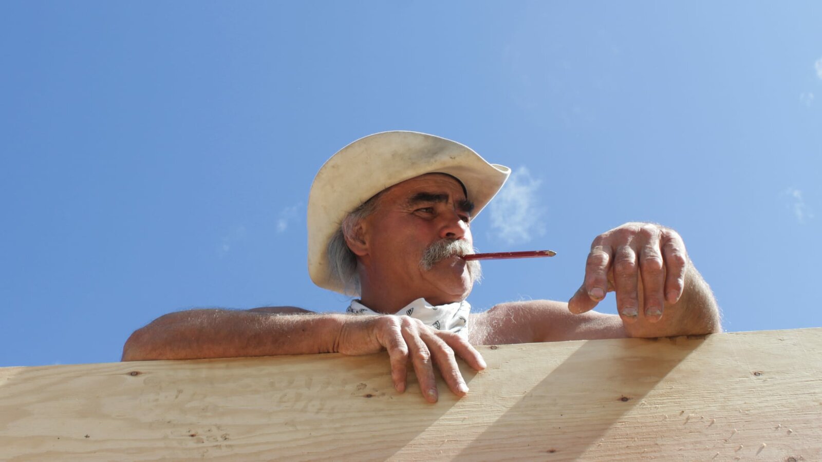 Wohnen auf der KlippeMarty is sitting down in his all-white shirt, bandana, and cowboy hat.Bild: © Discovery Channel / Discovery Communications, LLC / Scott Sandman