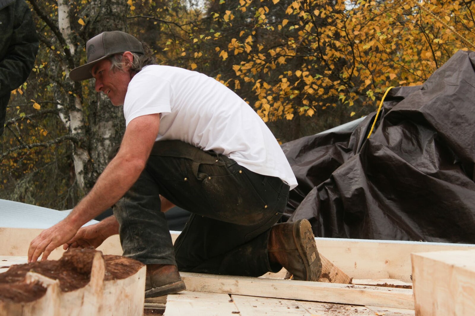 Regnerischer ZwischenfallMaciah is taking a knee while working on the roof of his new cabin.Bild: © Discovery Channel / Discovery Communications, LLC