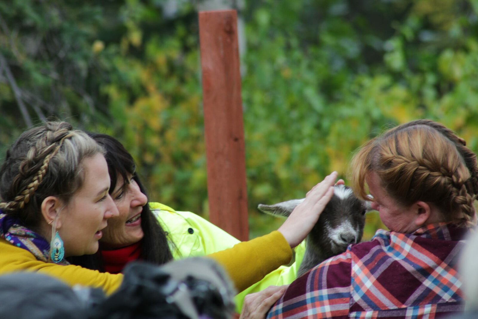 Wohnen auf der KlippeL-R: Katie and Mollee petting a goat while it's being held by its old owner.Bild: © Discovery Channel / Discovery Communications, LLC