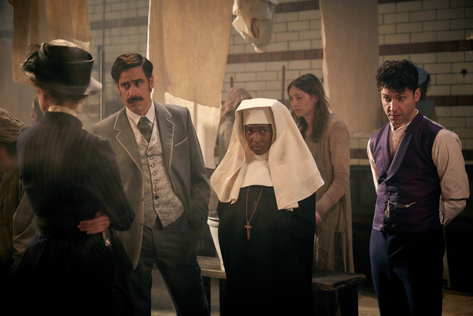 Mord aus dem Jenseits?V.l.: Adelaide Stratton (Rebecca Liddiard), Arthur Conan Doyle (Stephen Mangan), Winnie (Adelayo Adedayo), Harry Houdini (Michael Weston)Bild: © RTL Crime