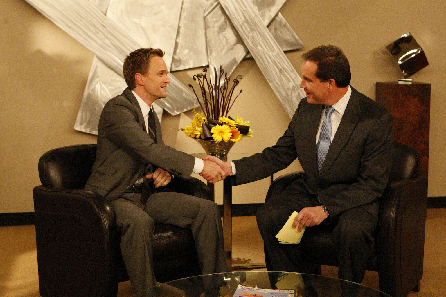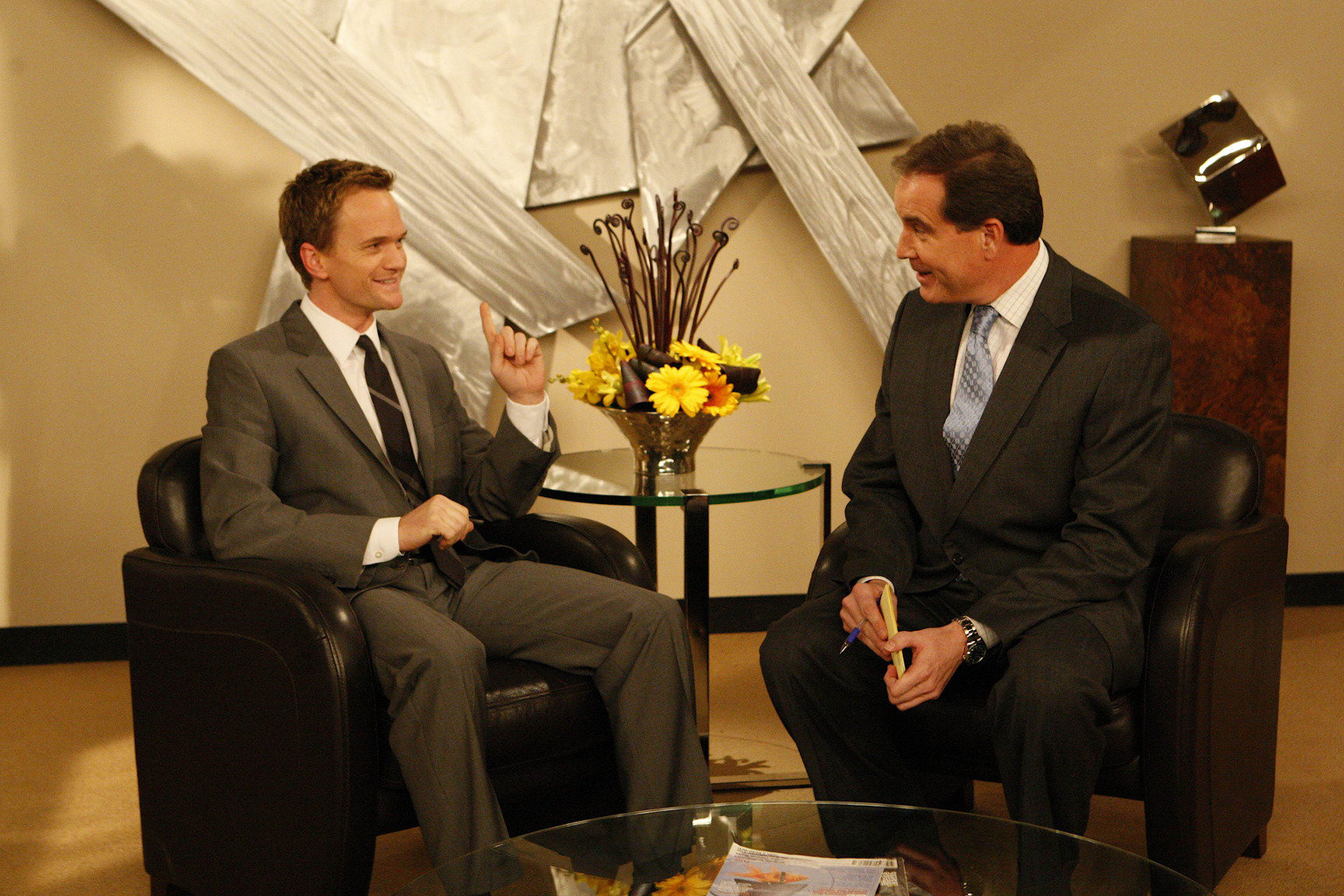 Die perfekte WocheBarney (Neil Patrick Harris, l.) stellt sich der großen Herausforderung, innerhalb einer Woche jeden Abend eine Frau aufzureißen. In einem eingebildeten Interview mit einem berühmten Sportreporter (Jim Nantz, r.) blickt Barney auf diese Woche zurück, während er auf ein Gespräch mit seinem Chef wartet ...Bild: © 20th Century Fox International Television Lizenzbild frei