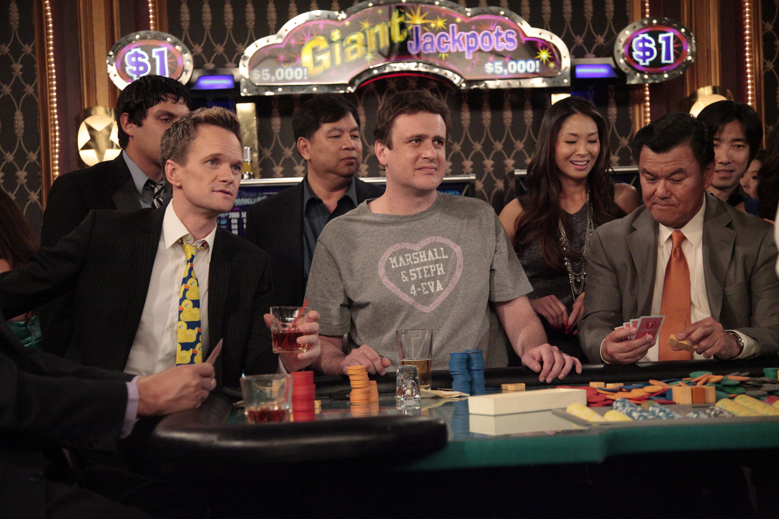 Die Ersatz-RobinMarshall (Jason Segel, vorne M.) und Barney (Neil Patrick Harris, vorne l.) erleben einen unvergesslichen Aufenthalt in Atlantic City ...Bild: © 2012 CBS Broadcasting, Inc. All Rights Reserved.
