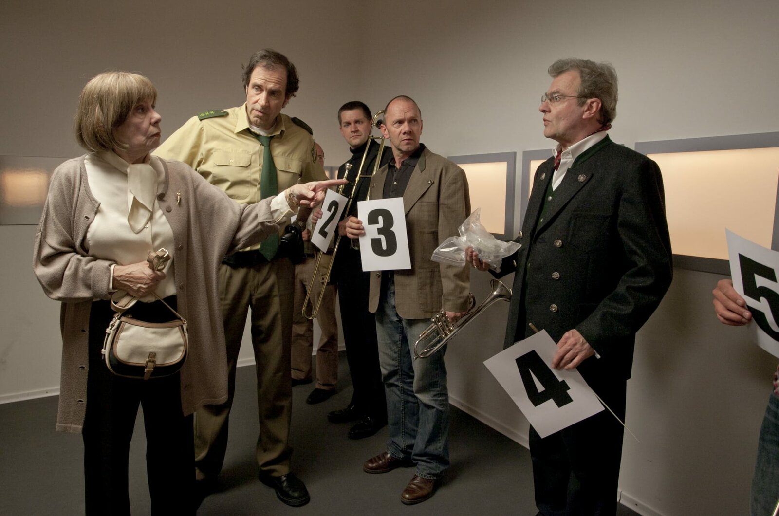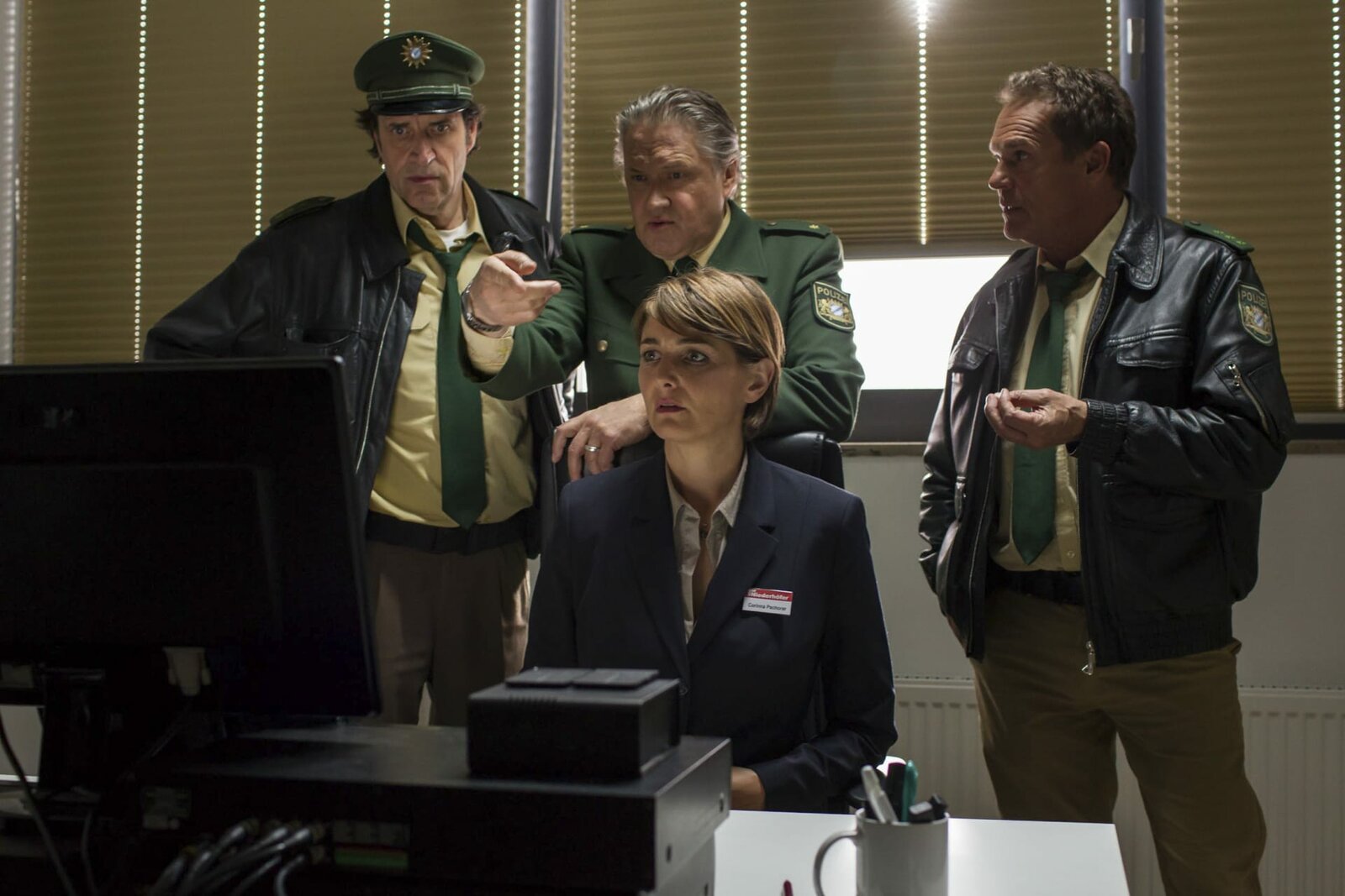 Mord im MöbellandHubert (Christian Tramitz, rechts), Staller (Helmfried von Lüttichau, links) und Girwidz (Michael Brandner, Mitte) entdecken gemeinsam mit Frau Pschorer (Nicole Marischka), dass auch die Ehefrau des Opfers ein Motiv gehabt hätte.Bild: © LEONINE Studios / Chris Hirschhäuser