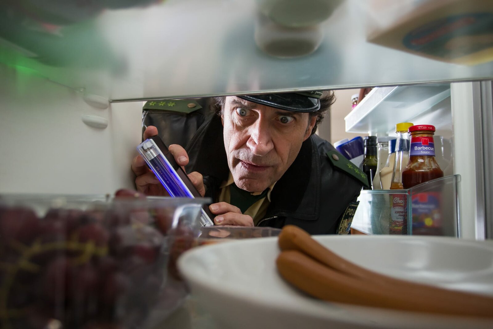 RosenkriegStaller (Helmfried von Lüttichau) forscht im Kühlschrank nach vergifteten Lebensmitteln.Bild: © TMG / Chris Hirschhäuser