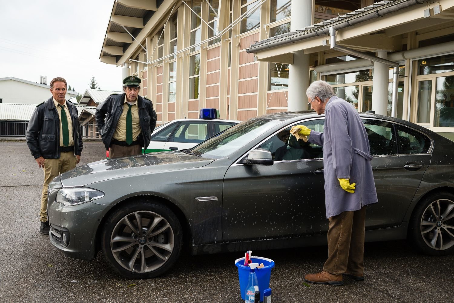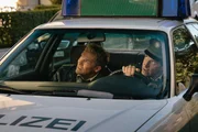 Steg mit AussichtVon links: Hubert (Christian Tramitz) und Staller (Helmfried von Lüttichau) beobachten vom Streifenwagen aus, dass Klaus Böttcher von einem Dach in die Tiefe springen will.Bild: © Leonine / Arvid Uhlig