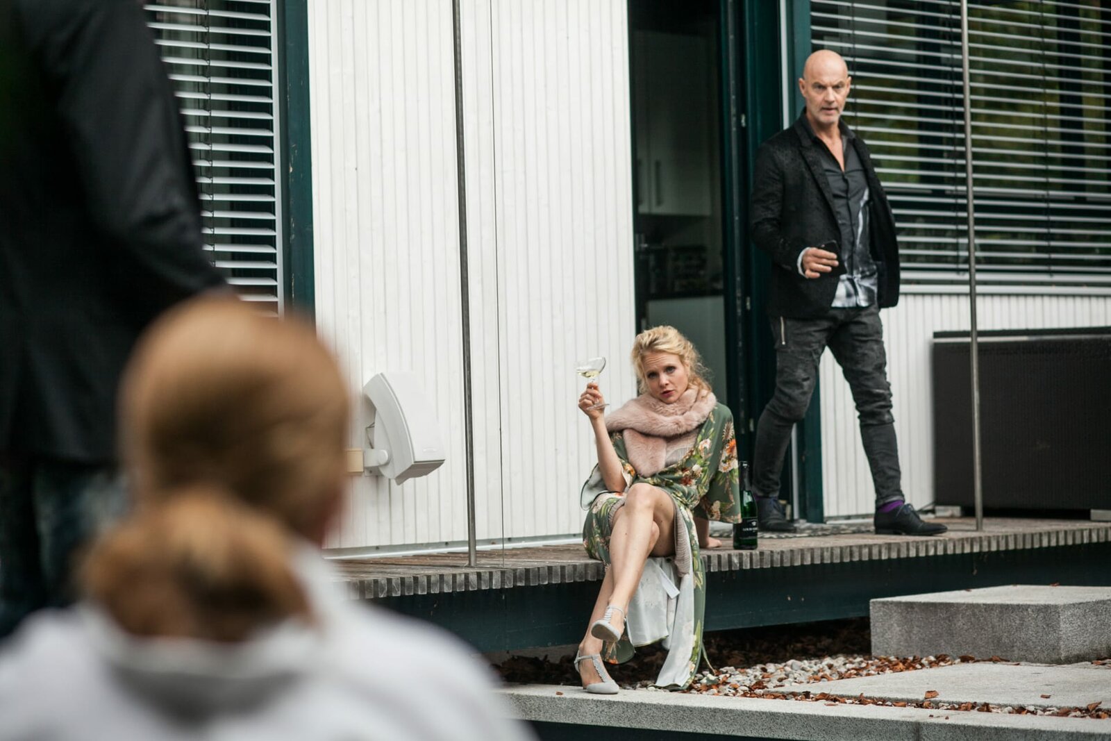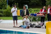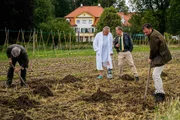 Haus am SeeZur beschwipsten Hausherrin Sandra Joschek (Friederike Ott, 2.v.l.) gesellt sich ihr Mann Bert (Simon Licht, r.). Sie nimmt dank des Champagners, den Leichenfund gelassen hin.Bild: © TMG / Chris Hirschhäuser