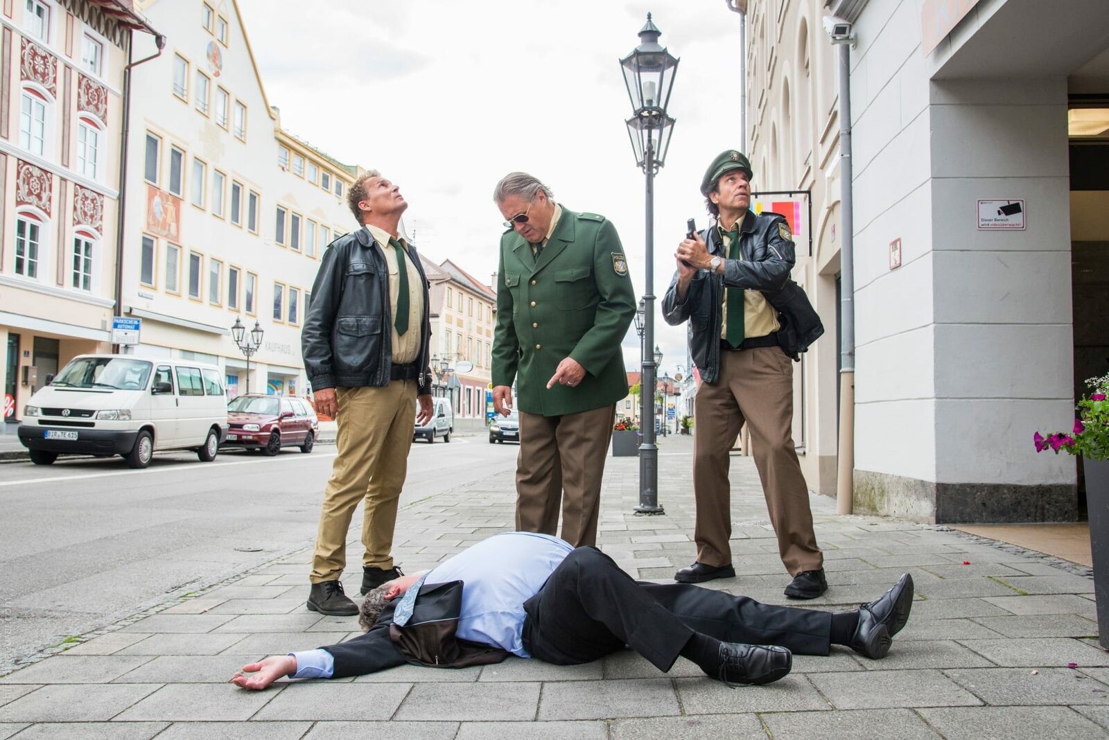 Hoch versichert, tief gefallenVor den Augen von Girwidz (Michael Brandner, M.), Hubert (christian Tramitz, l.) und Staller (Helmfried von Lüttichau, r.) stürzt der Bürgermeister (Komparse) aus dem Fenster.Bild: © TMG / Marco Meenen