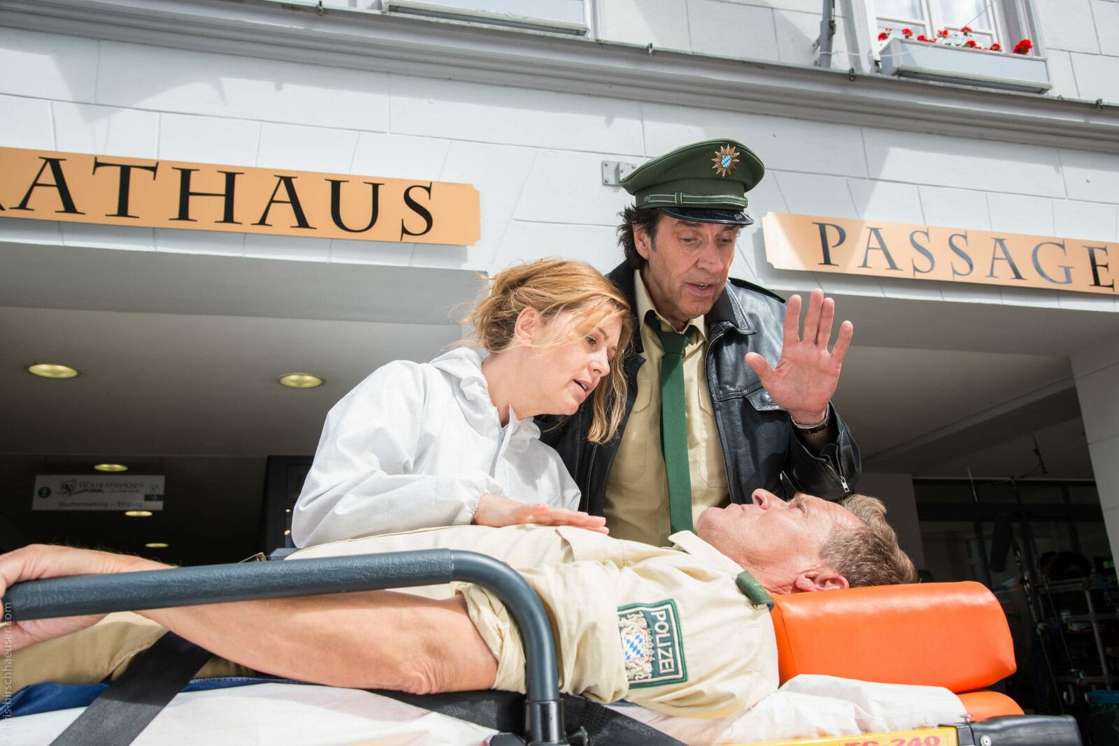 Hoch versichert, tief gefallenDr. Anja Licht (Karin Thaler), Johannes Staller (Helmfried von Lüttichau) und Franz Hubert (Christian Tramitz)Bild: © TMG / Chris Hirschhäuser/TMG / Chris Hirschhäuser/TMG / Chris Hirschhäuser