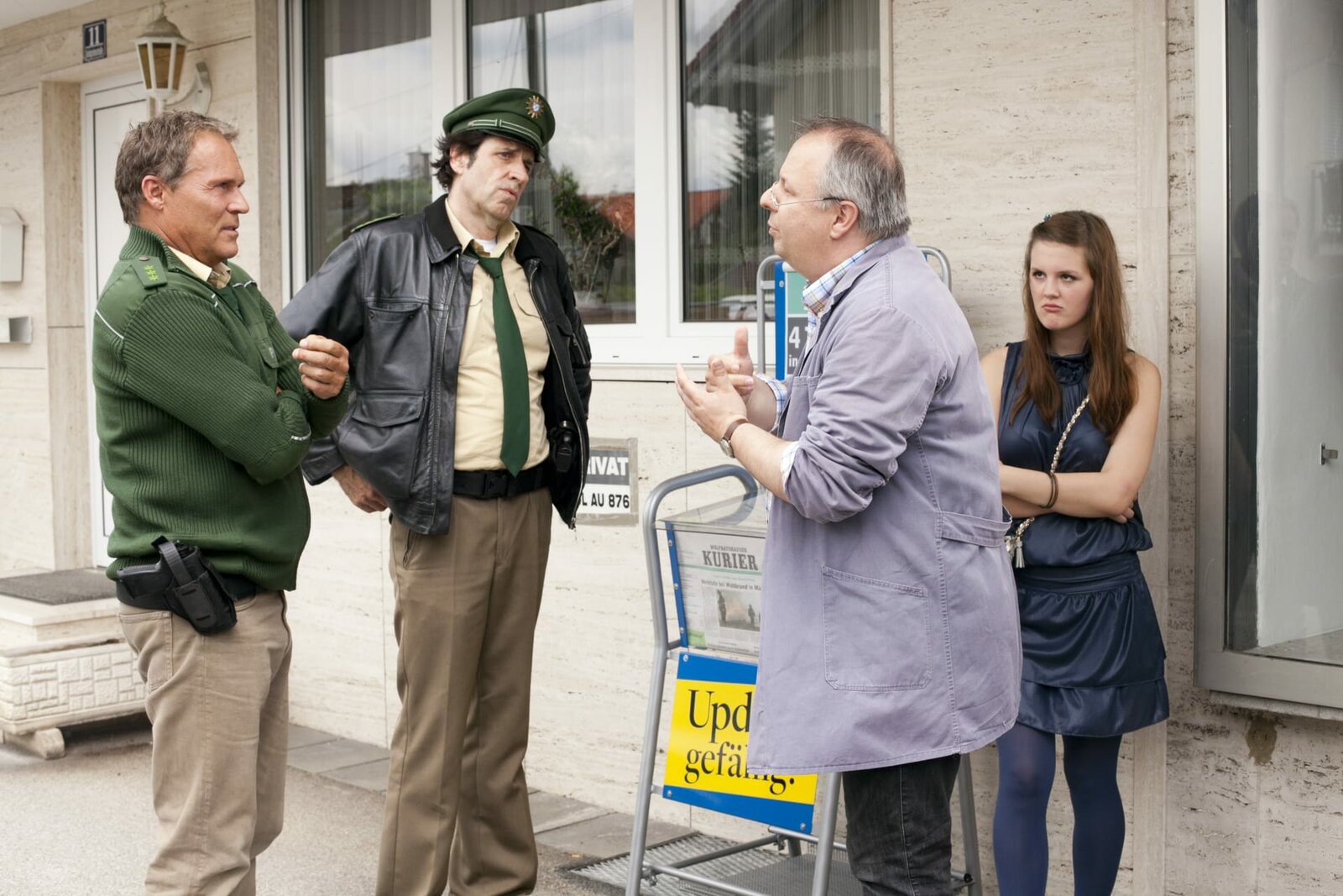 Reif für die AnstaltFranz Hubert (Christian Tramitz), Johannes Staller (Helmfried von Lüttichau), der Zeitungshändler (Markus H- Eberhard) und Johanna Griwidz (Alina Stiegler)Bild: © ServusTV Deutschland
