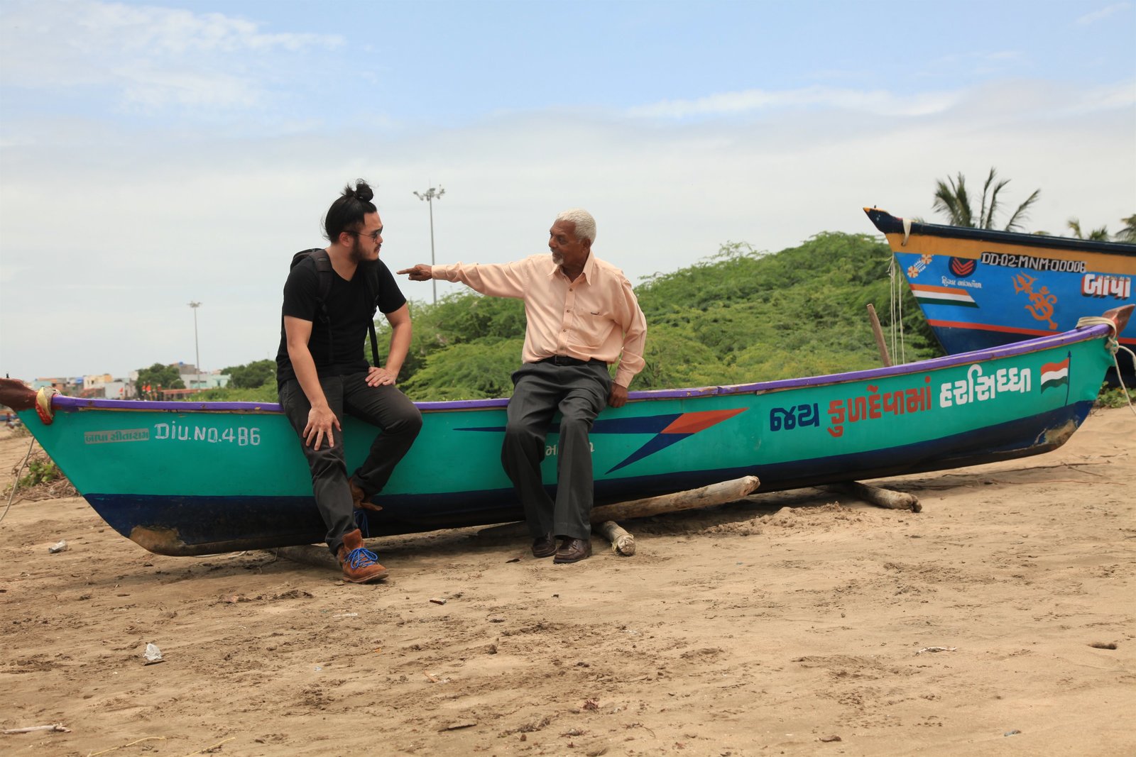 Hafen ohne WiederkehrDiu, India: RJ and Captain Fulbaria sit on a boat talking. A retired sea captain, Captain Fulbaria is now found in the Diu Seashell Museum where he painstakingly collects and presents thousands of seashells from around the world.Bild: © National Geographic Channels / Singha Quansuwan
