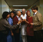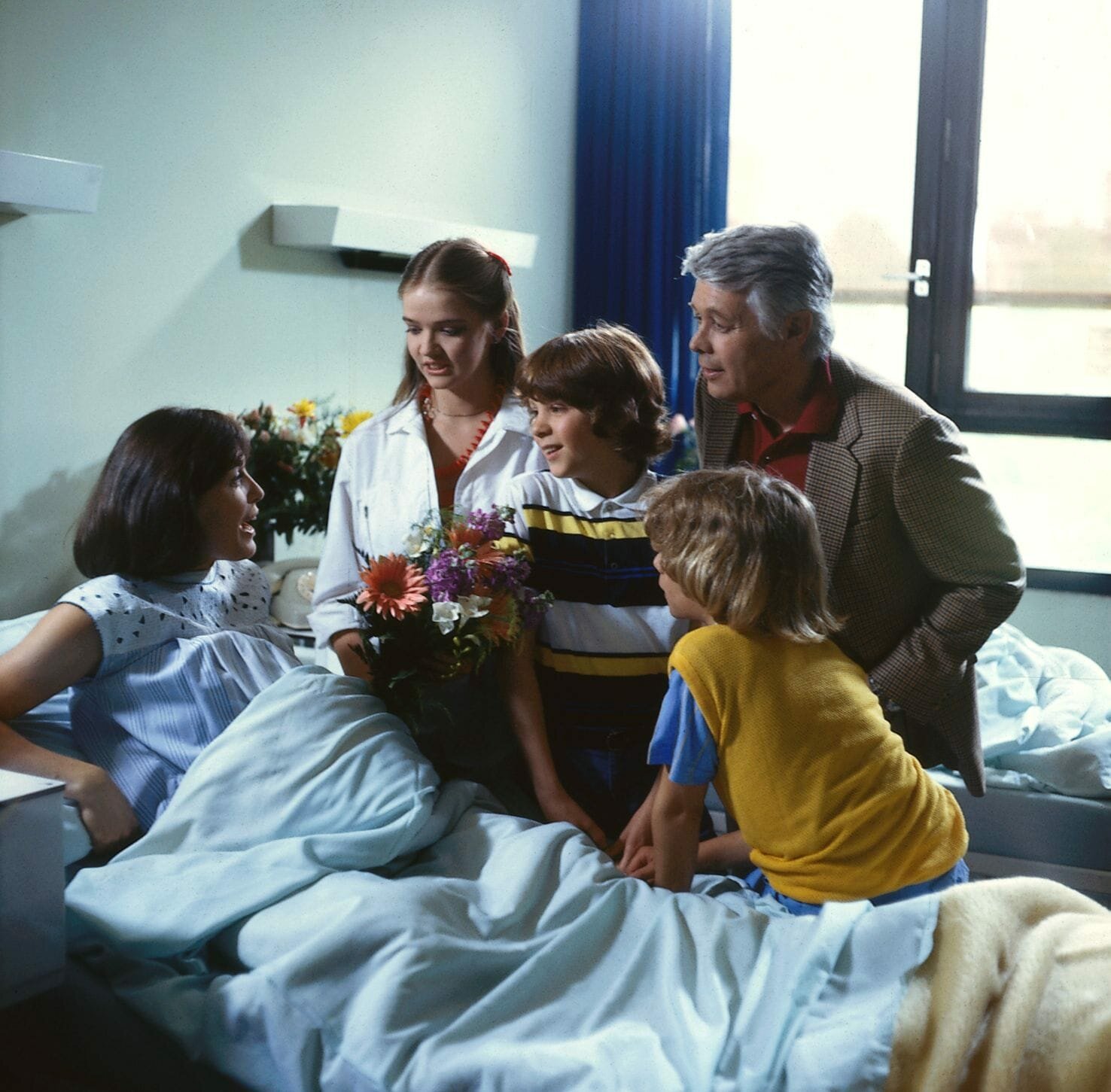 Familienzuwachs: Werner informiert sich ...Aufregung herrscht im Flur des Krankenhauses, als der Arzt (Robert Dietl, 3. v. r.) Werner (Peter Weck, 3. v. l.) mitteilt, wie groß Franziska bei der Geburt war. Dabei sind seine Freunde Wolfgang (Herbert Herrmann, l.), Bille (Maria Sebaldt, 2. v. r.) und Alfons (Herbert Bötticher, r.).Bild: © ZDF und Nova Film.