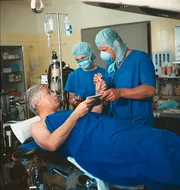 Angi muss sich entscheidenWerner fürchtet sich vor der Operation und schreibt Angi einige Zeilen zum Abschied, die er aber nur für den Fall seines Ablebens an Angi bestimmt hat. (Peter Weck auf der Bahre, restl. Darsteller nicht bekannt).Bild: © ORF/ZDF/Barbara Oloffs