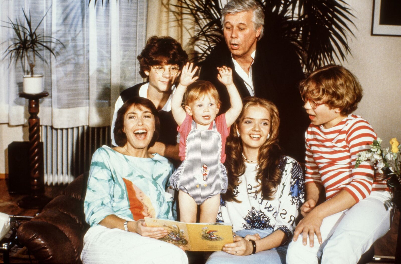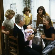 Der Freund20. Glückliche Frühstücksrunde im Hause Schumann: Franziska hat ihr Bäuerchen gemacht und die gesamte Familie freut sich darüber, während Franziska sich freut im Mittelpunkt zu stehen. (V.li.n.re.: Tarek Helmy, Peter Weck mit Franziska auf dem Arm, Timmo Niesner, Thekla Carola Wied, Julia Biedermann).Bild: © Nova Film