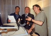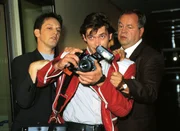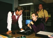 Schleichender TodDie beiden Kommissare Bongartz (Max Gertsch) und Kehler (Wolfgang Bathke, r.) versuchen, den aufdringlichen Journalisten (Tom Mikulla) zurückzuhalten.Bild: © RTLplus