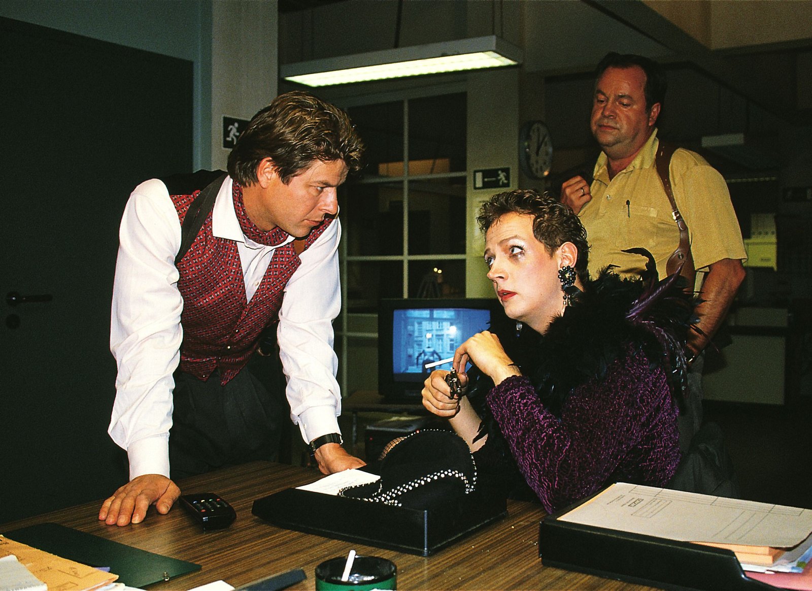 Der HausboySigurd Faust (Christoph Eichhorn) wird verdächtigt, einen jungen Mann veranlaßt zu haben, in den Tod zu springen. Die beiden Kommissare Wolniak (Uwe Fellensiek, li.) und Kehler (Wolfgang Bathke, re.) verhören ihn dazu.Bild: © RTLplus