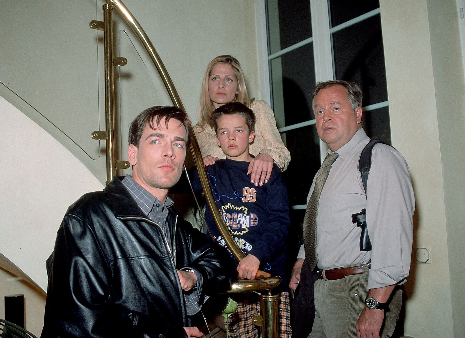 EntführtBonhoff (Wolfgang Krewe, li.), Sybille (Rhoda Kaindl, hi.), Jacob (Mark Reinhart, Mi.) und Kehler (Wolfgang Bathke) warten darauf, dass sich der Entführer von Ricky meldet.Bild: © RTLplus / Rolf Baumgartner