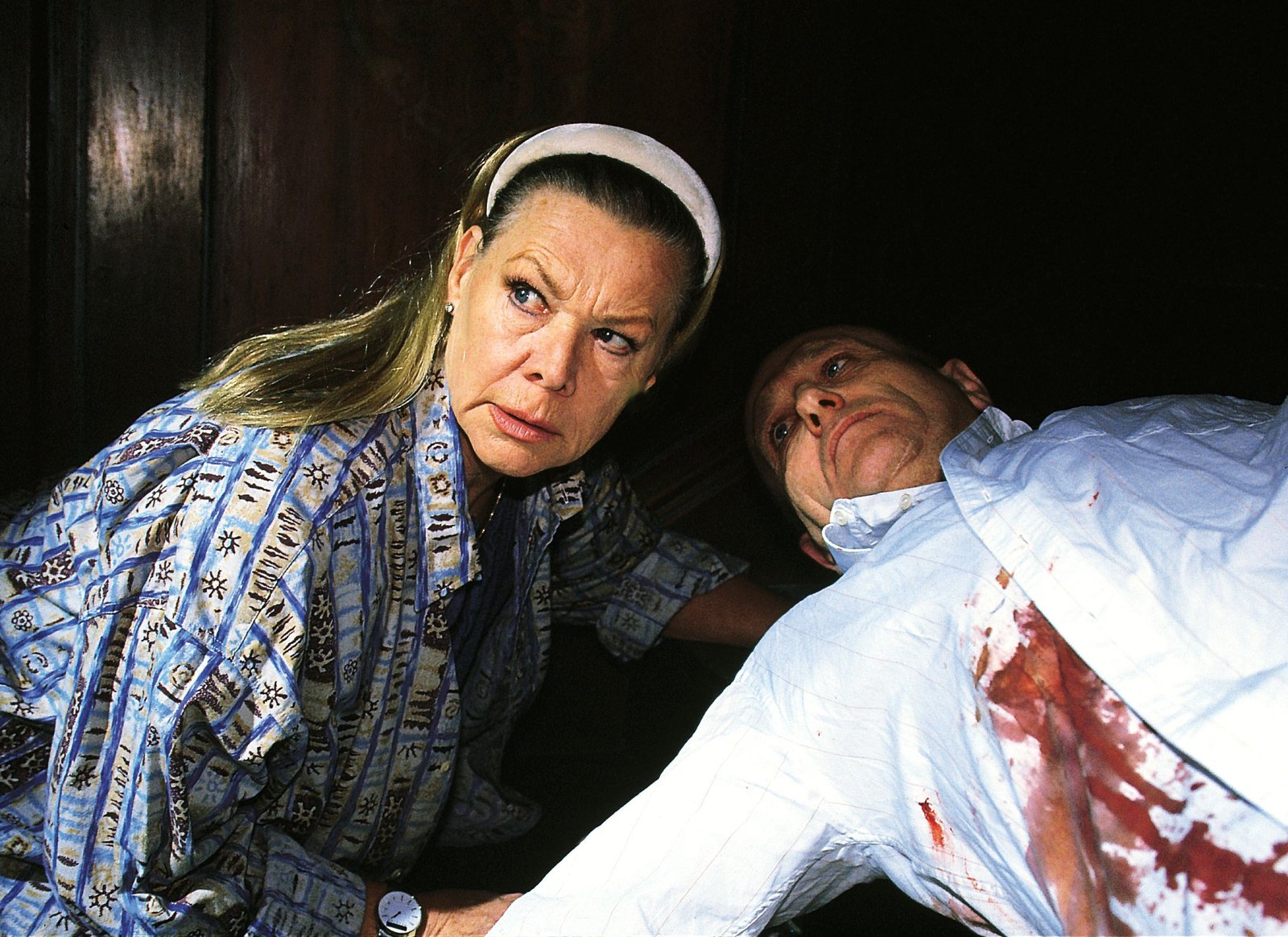 Hinter den KulissenHausmeisterin Erna Knoppe (Ingrid van Bergen) entdeckt im Treppenhaus die Leiche des Bankiers Alfons Renier.Bild: © RTLplus