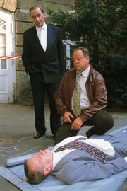 FehlurteilRichter Mühlendahl (Komparse, lieg.) wurde aus dem Fenster seines Dienstzimmers gestoßen. Oberstaatsanwalt Lotze (li. Henry van Lyck) und Kommissar Kehler (Wolfgang Bathke) sind entsetzt.Bild: © RTLplus