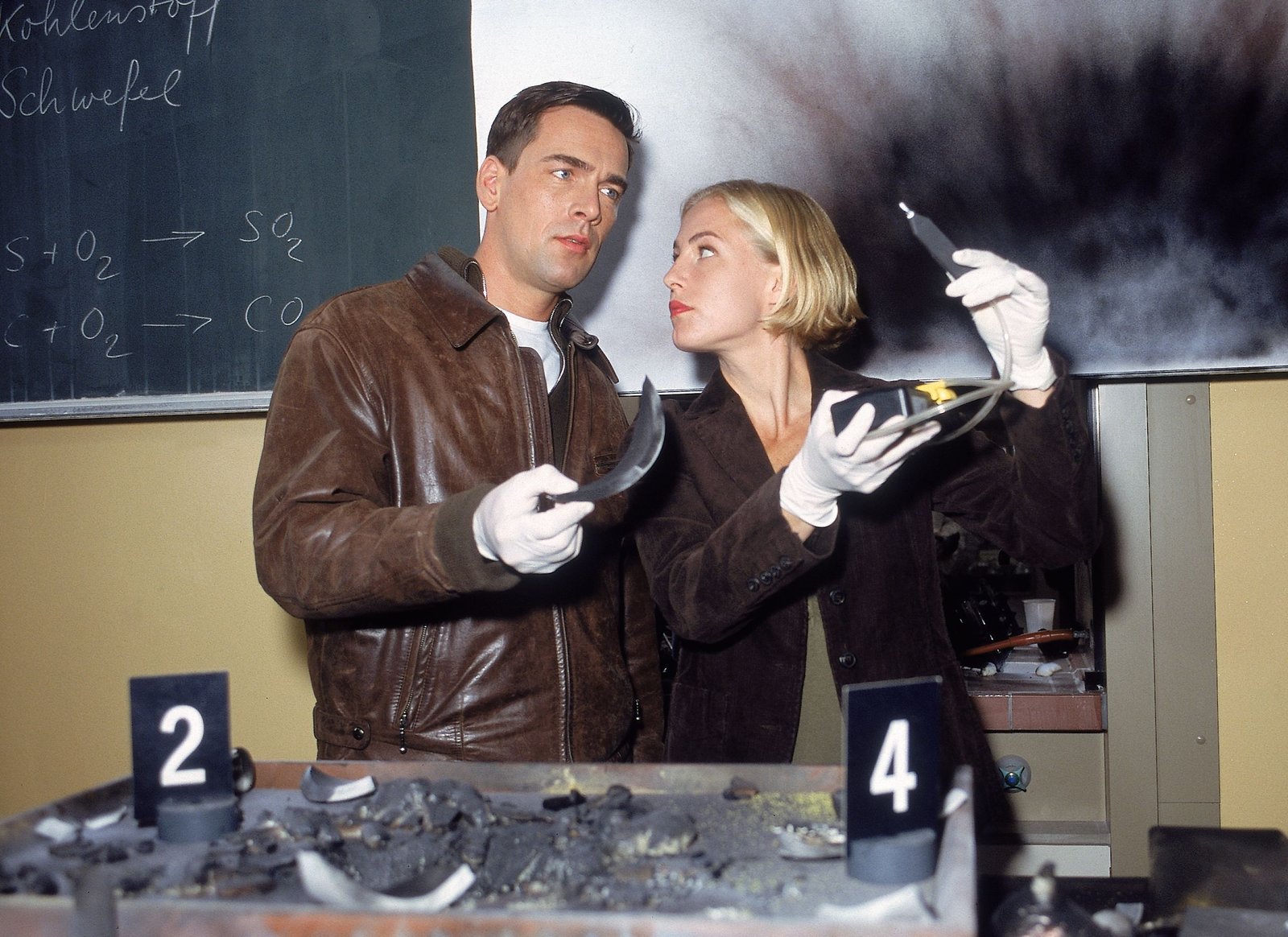 PanikBei der kriminaltechnischen Untersuchung stellt Svenja (Li Hagman) fest, dass die Versuchsanordnung bei dem Chemieunterricht manipuliert wurde. Kommissar Bonhoff (Wolfgang Krewe) ist klar: der Chemielehrer wurde also ermordet...Bild: © MG RTL D / Rolf Baumgartne