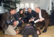 Der dressierte TodAm Tatort: Gerichtsmediziner Dr. Duhler (Klaus Schindler, li.), Staatsanwältin Glaser (Britta Schmeling, 2.v.li.), Kommissar Bonhoff (Wolfgang Krewe, 2. v.re.) und Kommissar Kehler (Wolfgang Bathke) versuchen den Tathergang zu rekonstruieren.Bild: © RTLplus / Rolf Baumgartner