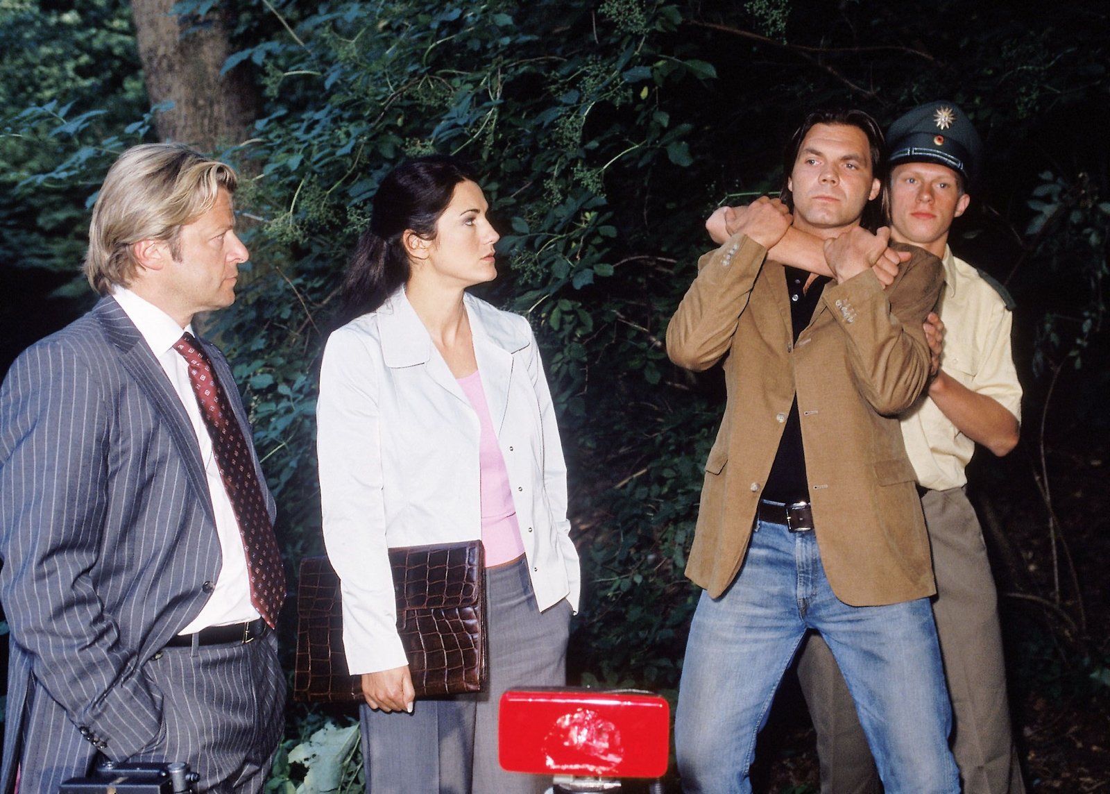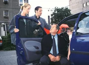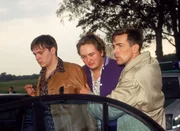 Späte RacheFabian (Patrick Heinrich, li.) und Arno (Daniel Zillmann, Mi.) werden nach der Amokfahrt von Kommissar Bonhoff (Wolfgang Krewe) verhaftet und geben sich völlig überrascht, als man in ihrem Wagen die Leiche von Beate Perlach findet.Bild: © MG RTL D / Rolf Baumgartne