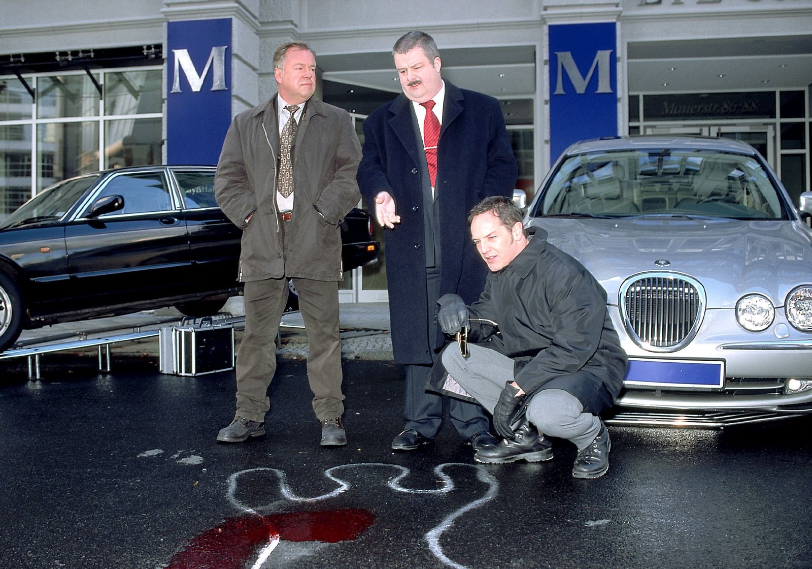 Falsche FreundeDie Kommissare Kehler (Wolfgang Bathke, li.) und Bongartz (Max Gertsch, re.) wollen wissen, ob der Angestellte des Autohauses (Erich Bar) weiss, warum sein Chef ermordet wurde und ob es mögliche Feinde gibt.Bild: © RTLplus