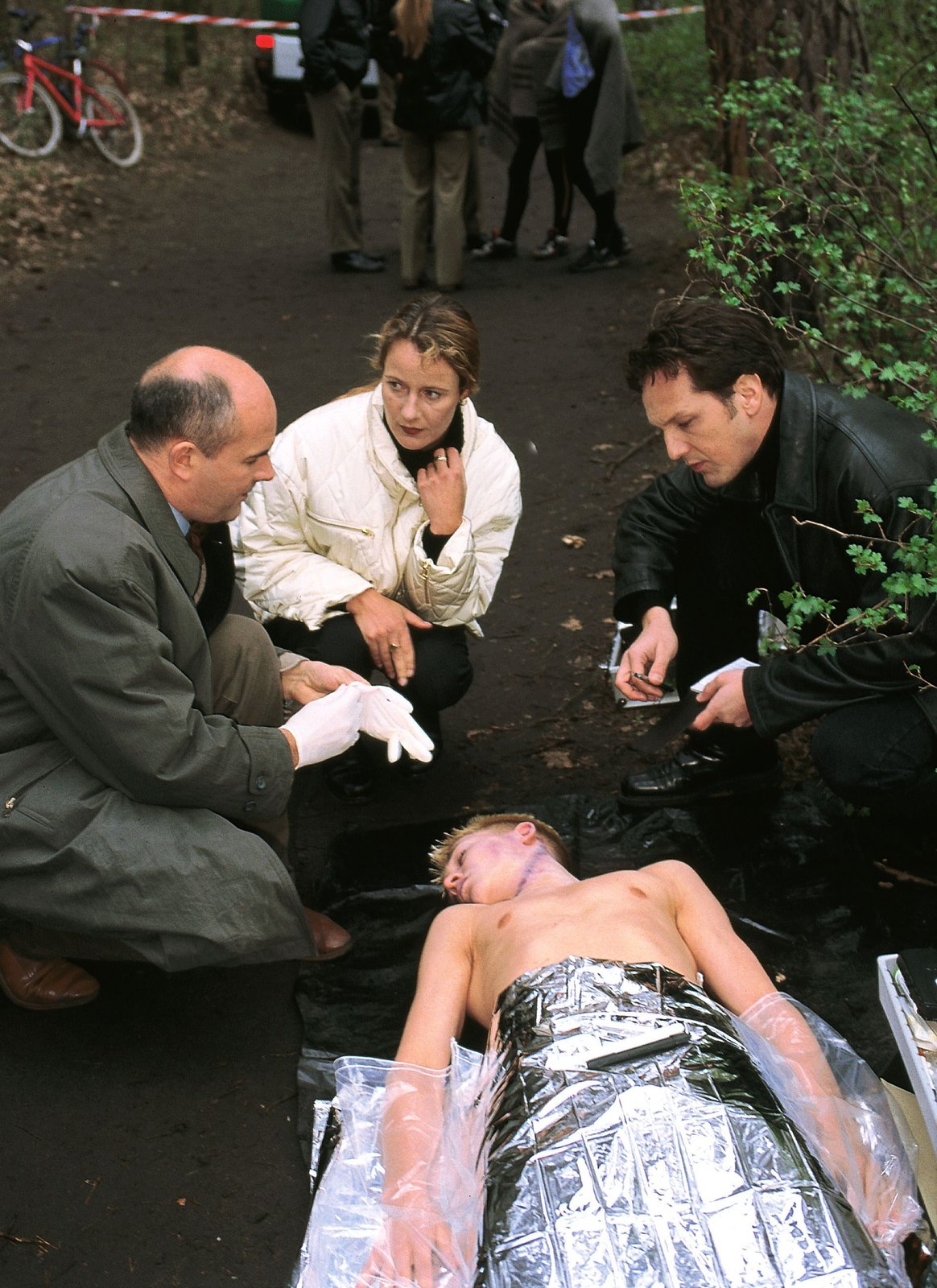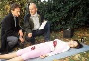 Tödliches TrainingDie Leiche eines Jungen (Komparse, lieg.) ist gefunden worden. Der Gerichtsmediziner (Klaus Schindler, li.) spricht mit der Staatsanwältin (Britta Schmeling) und Ralf Bongartz (Max Gertsch) über eine mögliche Todesursache.Bild: © RTLplus